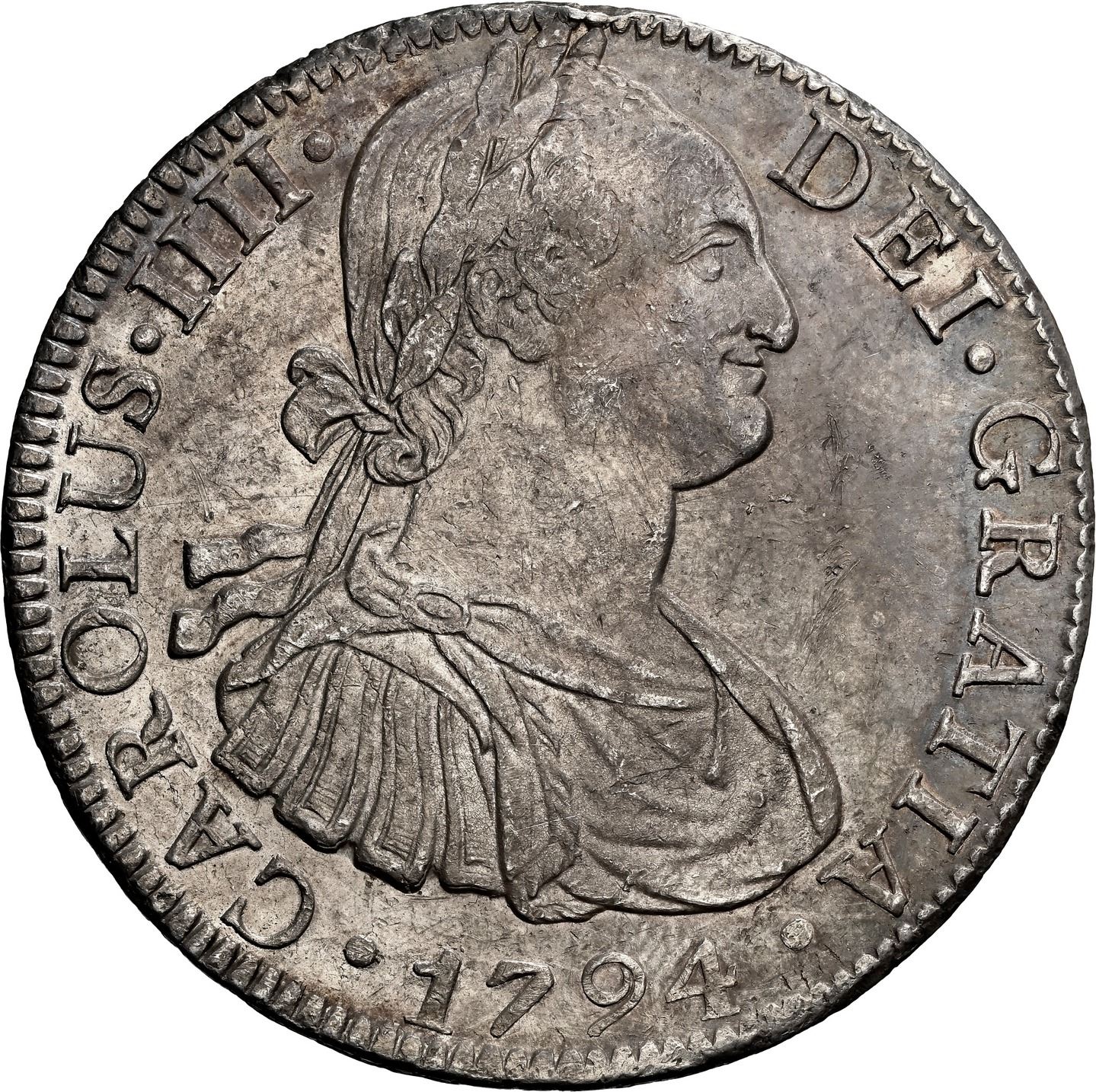 MEXICO, Mexico City, bust 8 reales, Charles IV, 1794 FM, NGC AU 55.