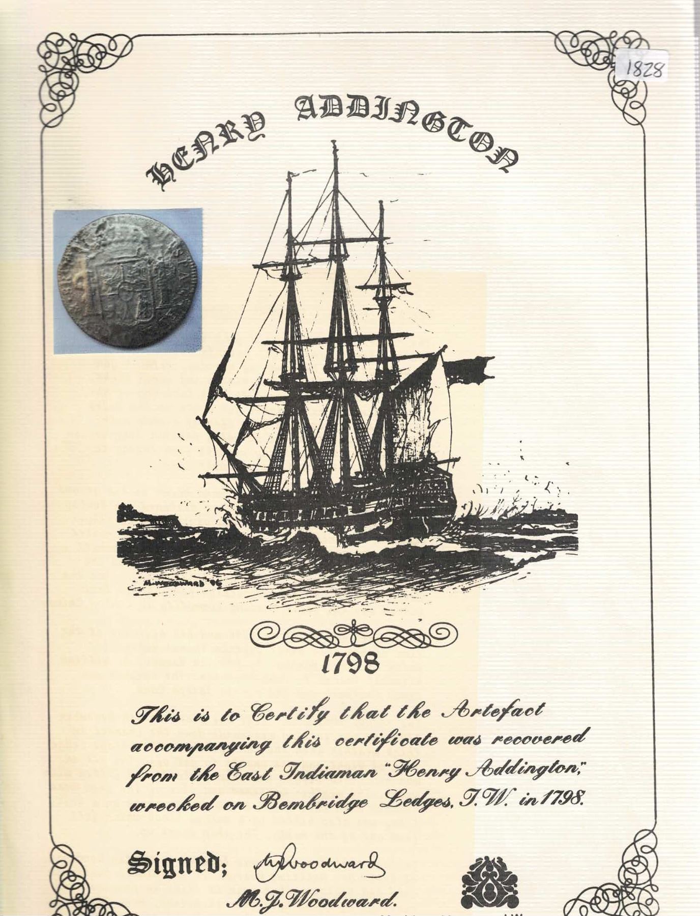 MEXICO, Mexico City, bust 8 reales, Charles IV, 1795 FM, rare provenance. Yonaka-M8.95; Cal-958; KM-109. 15.65 grams. Heavily corroded but with just enough of the date and assayer visible, rare provenance (see prior lot for a brief write-up on the ship). With original photo-certificate from the salvor. Recovered from: Henry Addington, sunk in 1798 off the Isle of Wight, south of England