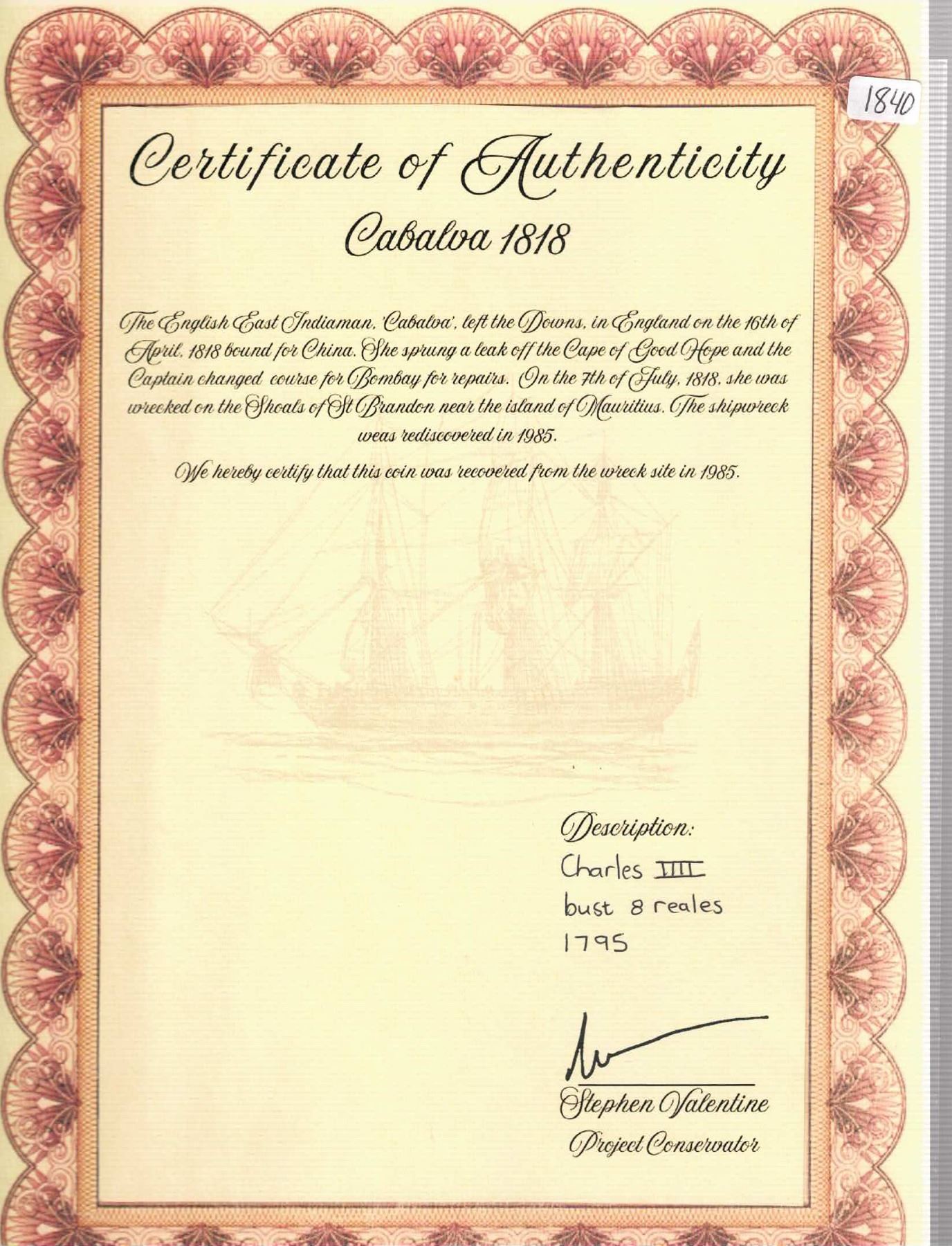 MEXICO, Mexico City, bust 8 reales, Charles IV, 1795 FM. Yonaka-M8.95; Cal-958; KM-109. 24.45 grams. Better quality than usually encountered from this wreck with mild surface corrosion yet solid with clear details throughout. Pedigreed to the Steve Valentine Collection, with original certificate from the salvor/conservator. Recovered from: Cabalva, sunk in 1818 off Mauritius in the Indian Ocean