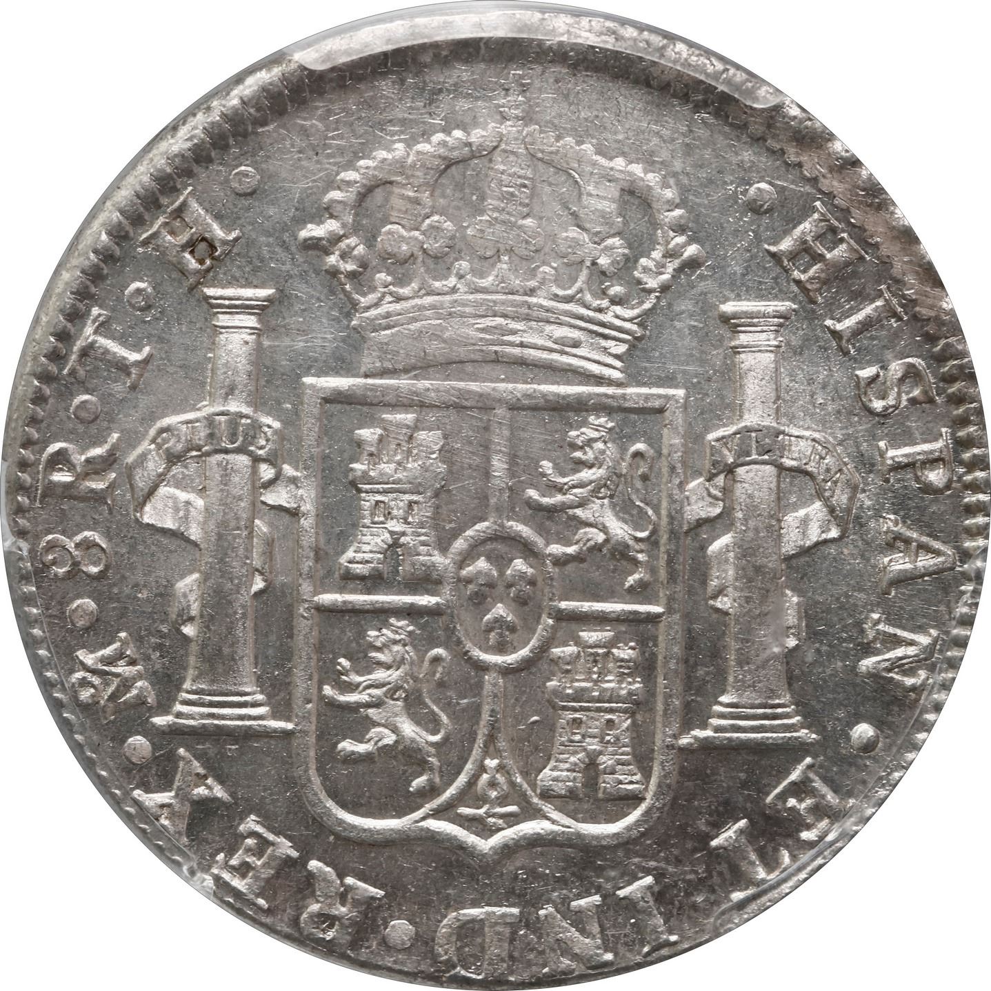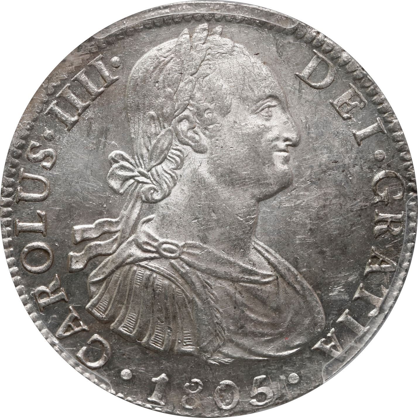 MEXICO, Mexico City, bust 8 reales, Charles IV, 1805 TH, PCGS MS62. KM-109; Cal-983; Yonaka-M8.105. Super bright from luster and lack of toning, the reverse even slightly prooflike, all well struck, the obverse slightly hairlined.