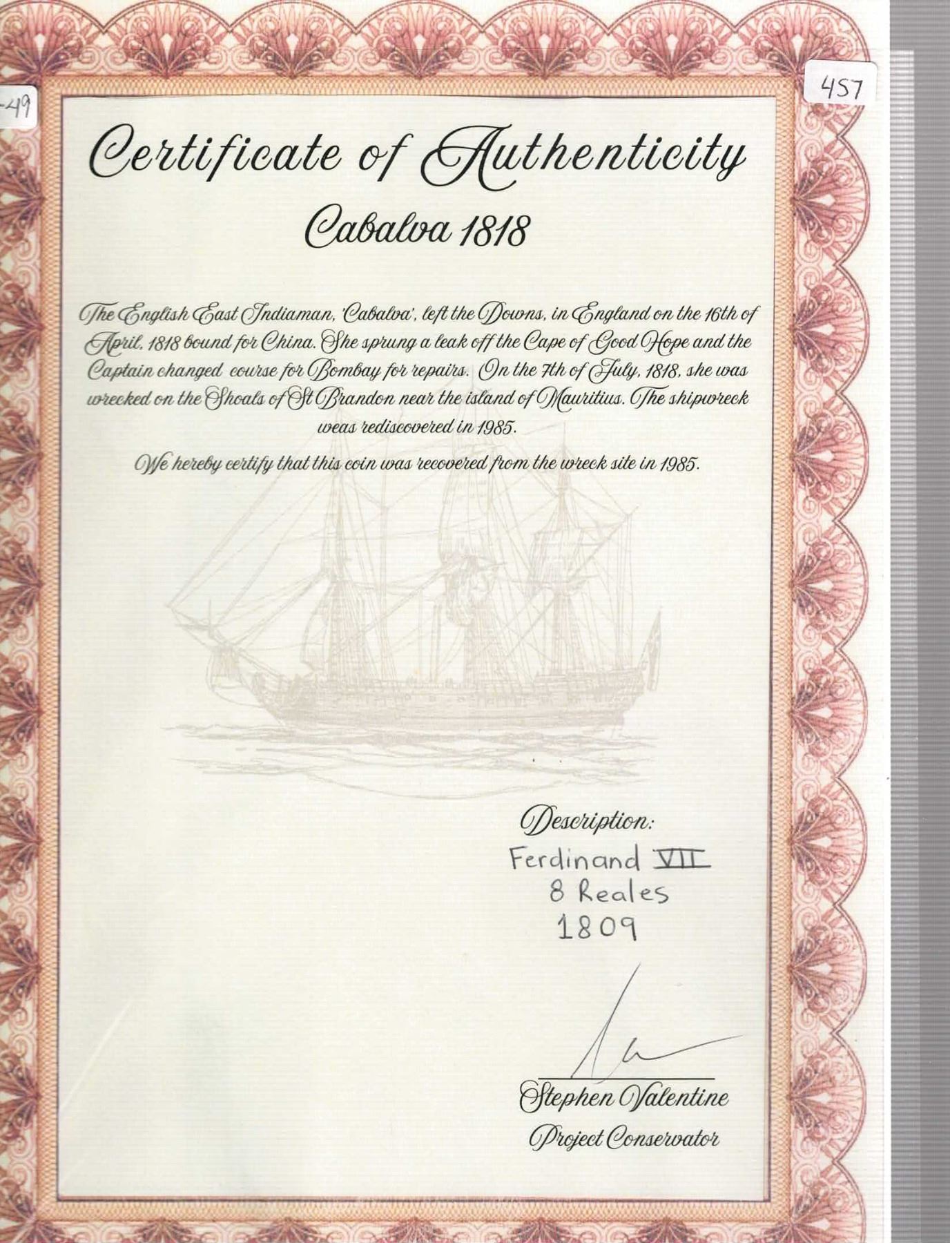 MEXICO, Mexico City, bust 8 reales, Ferdinand VII transitional ("armored" bust), 1809 HJ. Yonaka-M8.109a; KM-110; Cal-1310. 24.70 grams. Bold Fine details despite light surface corrosion, small edge-dent, light contrasting toning. Pedigreed to the Steve Valentine Collection, with original certificate from the salvor/conservator. Recovered from: Cabalva, sunk in 1818 off Mauritius in the Indian Ocean