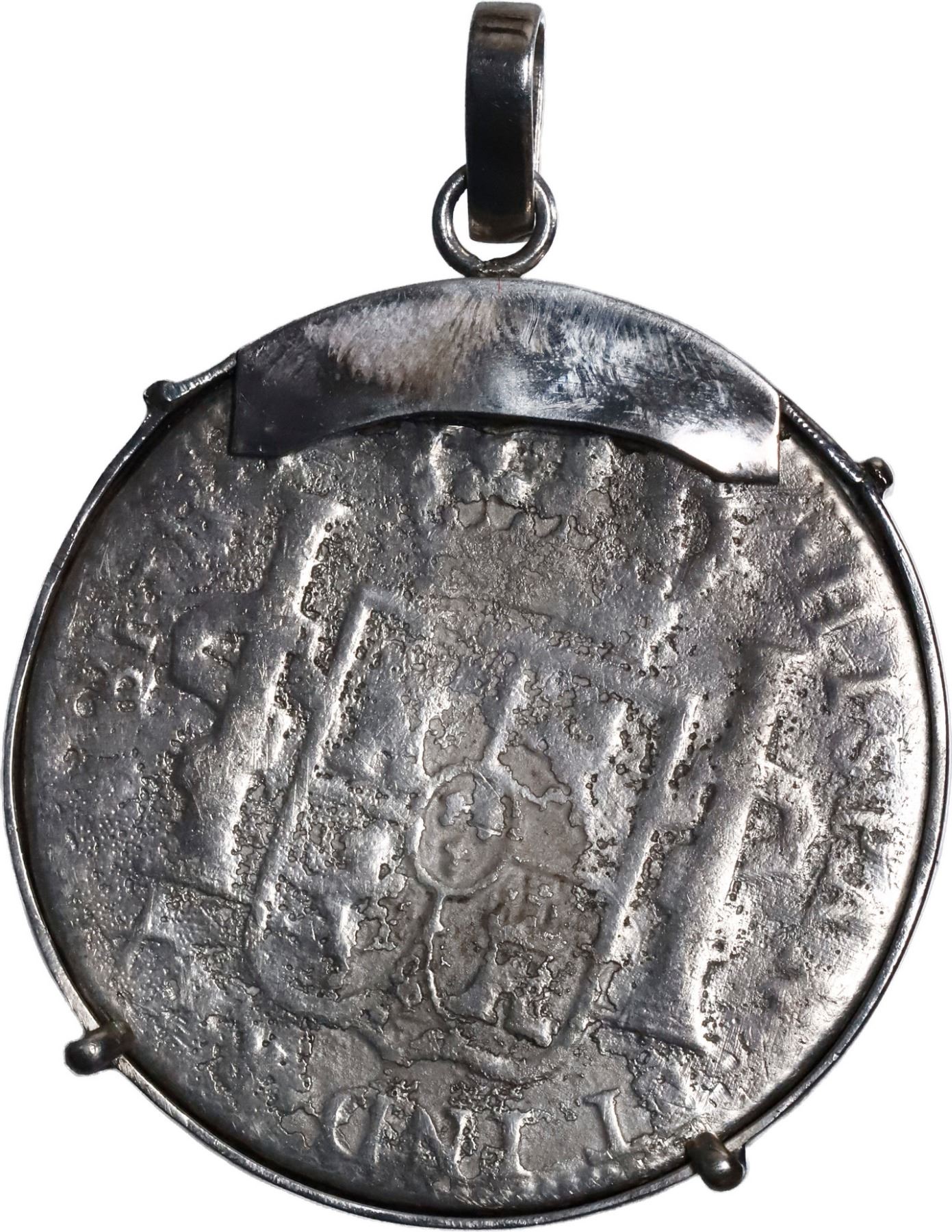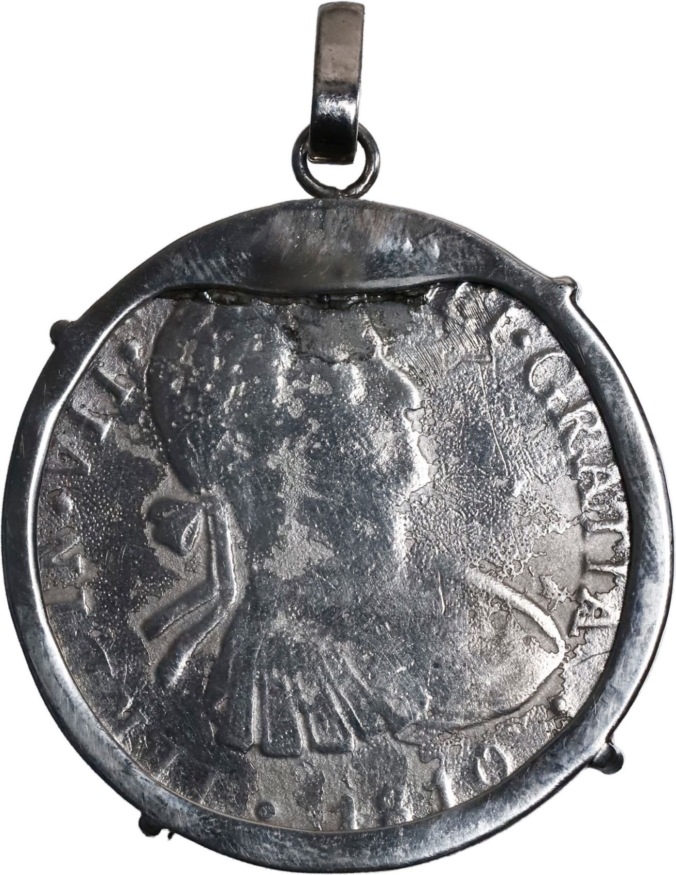 MEXICO, Mexico City, bust 8 reales, Ferdinand VII transitional ("armored" bust), 1810 HJ, ex-"1810 wreck," mounted bust-side out in silver bezel with ring bail. 25.50 grams total. About XF with moderate surface corrosion, clear date. With Cobb Coin Co. (Fisher) tag and photo-certificate 21754.