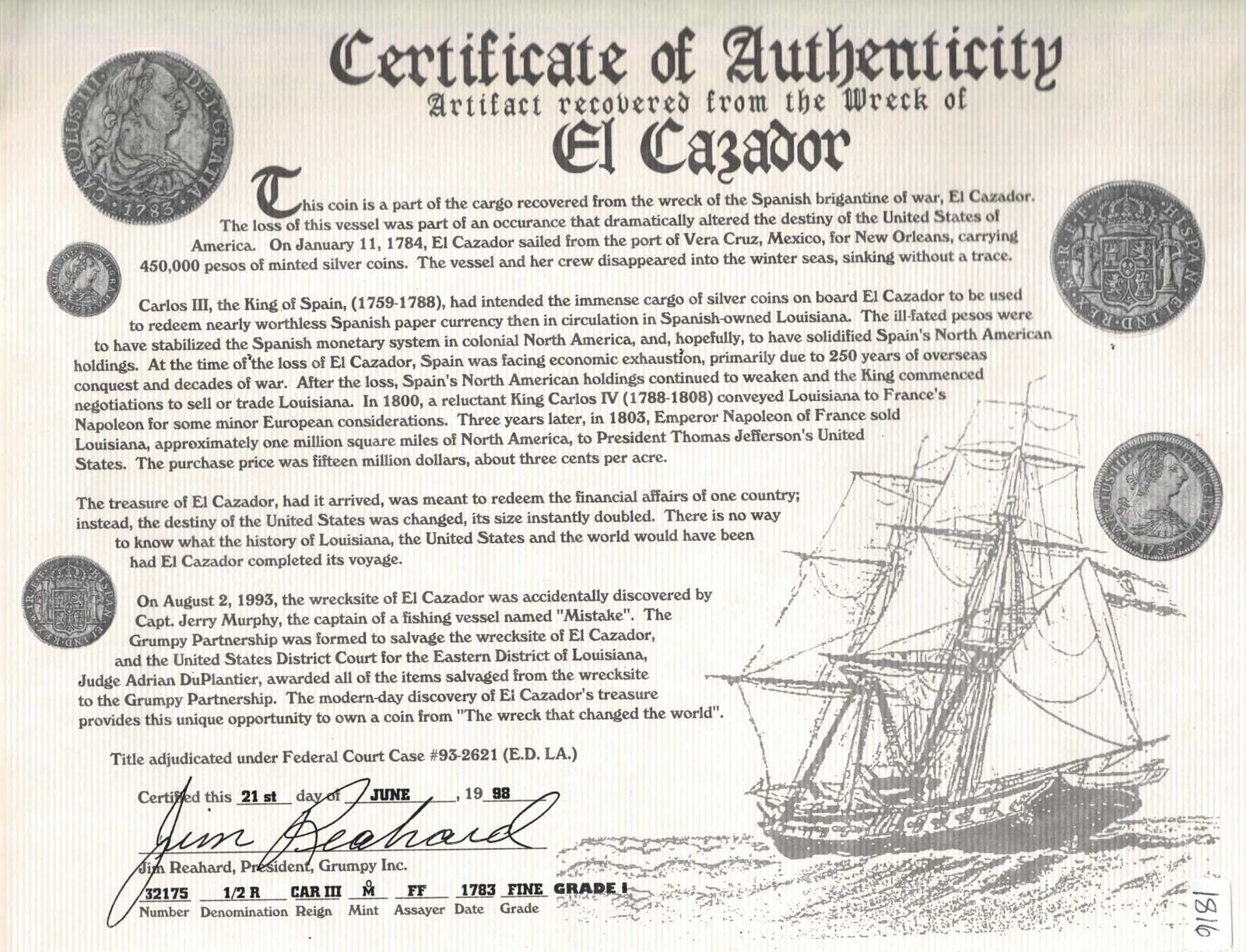 MEXICO, Mexico City, bust ½ real, Charles III, 1783 FF, NGC AU details / saltwater damage (El Cazador Shipwreck Label). Yonaka-M05.83; KM-69.2; Cal-211. Well-detailed piece with dark-toned, lightly corroded surfaces. With original Reahard certificate 32175. Recovered from: El Cazador, sunk in 1784 in the Gulf of Mexico