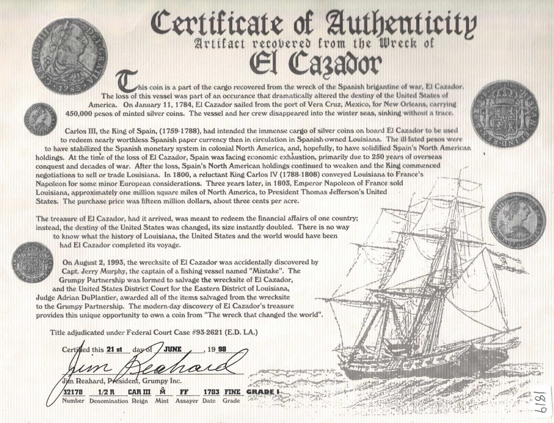 MEXICO, Mexico City, bust ½ real, Charles III, 1783 FF, NGC AU details / saltwater damage (El Cazador Shipwreck Label). Yonaka-M05.83; KM-69.2; Cal-211. Very nice piece with full details and light corrosion, darkly toned fields. With original Reahard certificate 32178. Recovered from: El Cazador, sunk in 1784 in the Gulf of Mexico