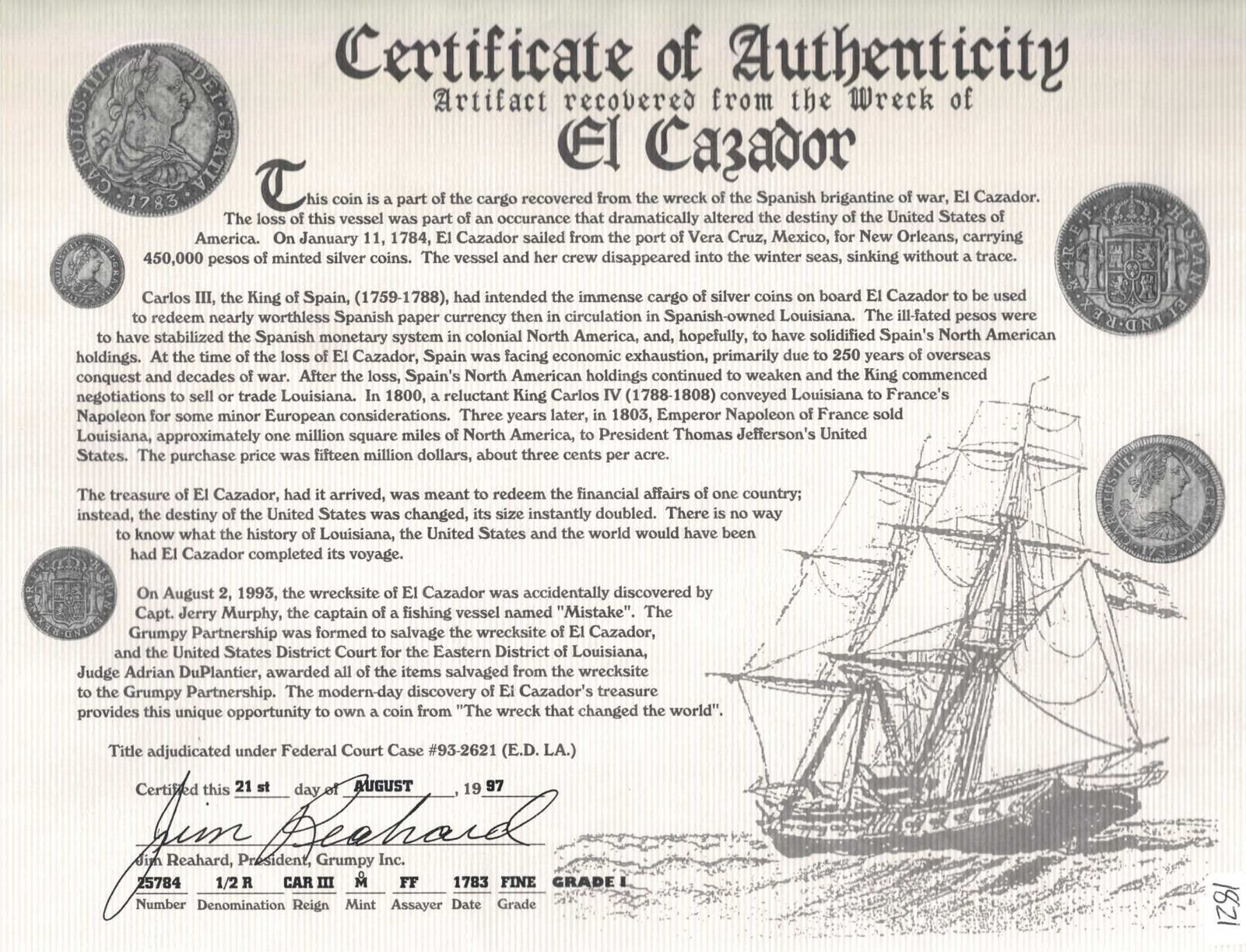 MEXICO, Mexico City, bust ½ real, Charles III, 1783 FF, NGC AU details / saltwater damage (El Cazador Shipwreck Label). KM-69.2; Cal-211; Yonaka-M05.83. Steely-toned piece with sharp details and some luster, very minimal saltwater corrosion. With original Reahard certificate 25784. Recovered from: El Cazador, sunk in 1784 in the Gulf of Mexico