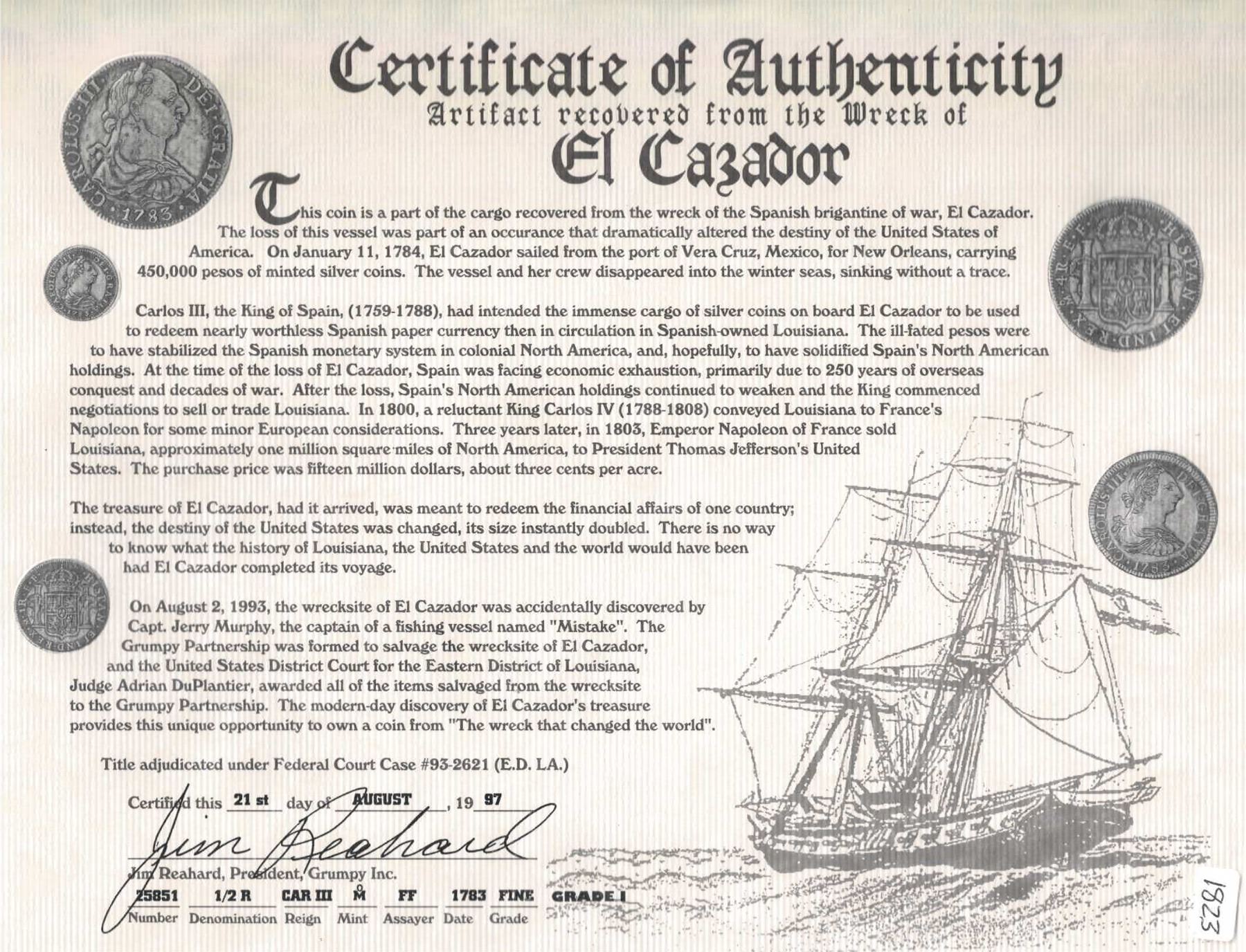 MEXICO, Mexico City, bust ½ real, Charles III, 1783 FF, NGC AU details / saltwater damage (El Cazador Shipwreck Label). Yonaka-M05.83; KM-69.2; Cal-211. Darkly toned piece with light surface corrosion in the fields. With original Reahard certificate 25851. Recovered from: El Cazador, sunk in 1784 in the Gulf of Mexico