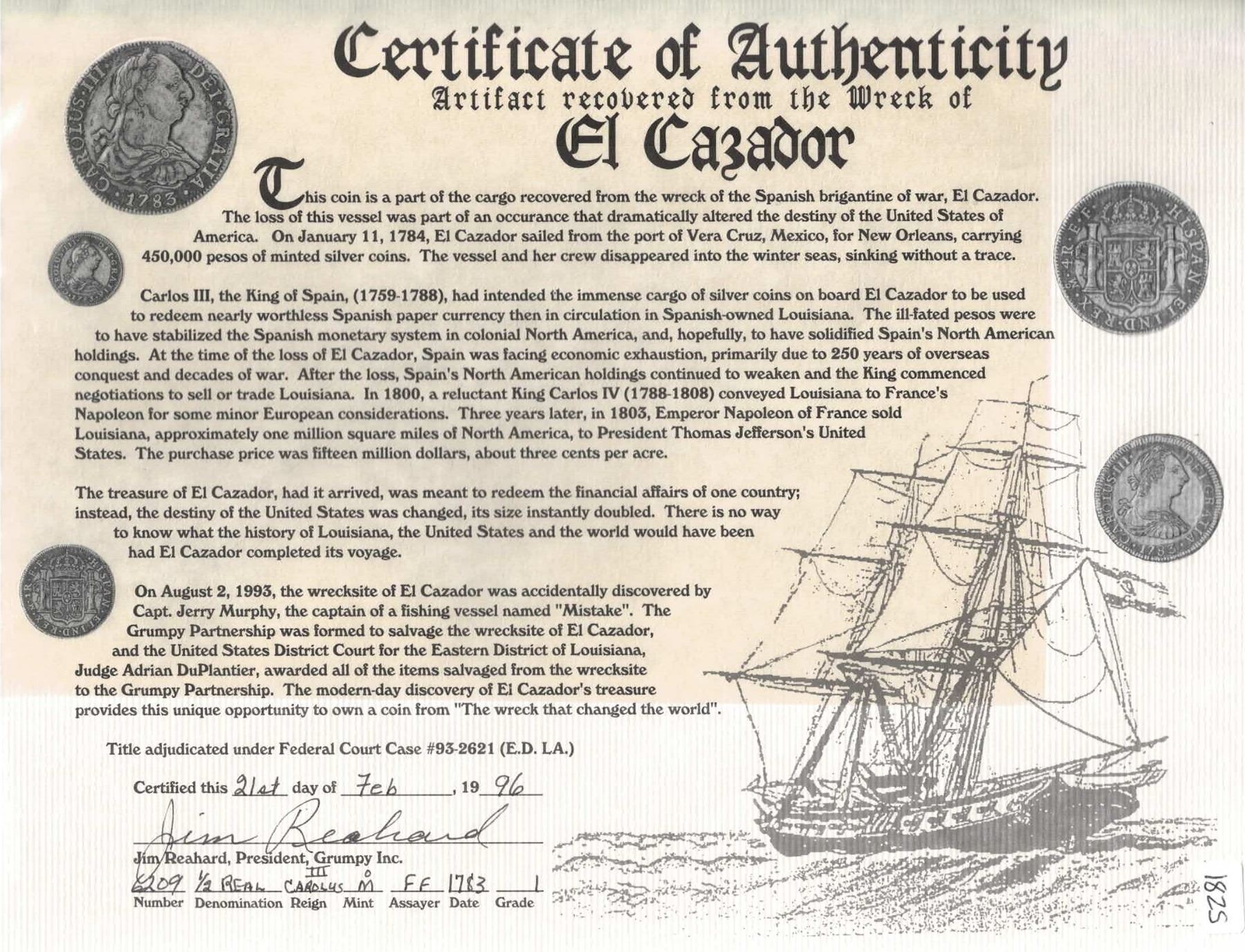 MEXICO, Mexico City, bust ½ real, Charles III, 1783 FF. Yonaka-M05.83; KM-69.2; Cal-211. 1.53 grams. AU with moderate surface corrosion. With original certificate 6209 and envelope from the salvors. Recovered from: El Cazador, sunk in 1784 in the Gulf of Mexico