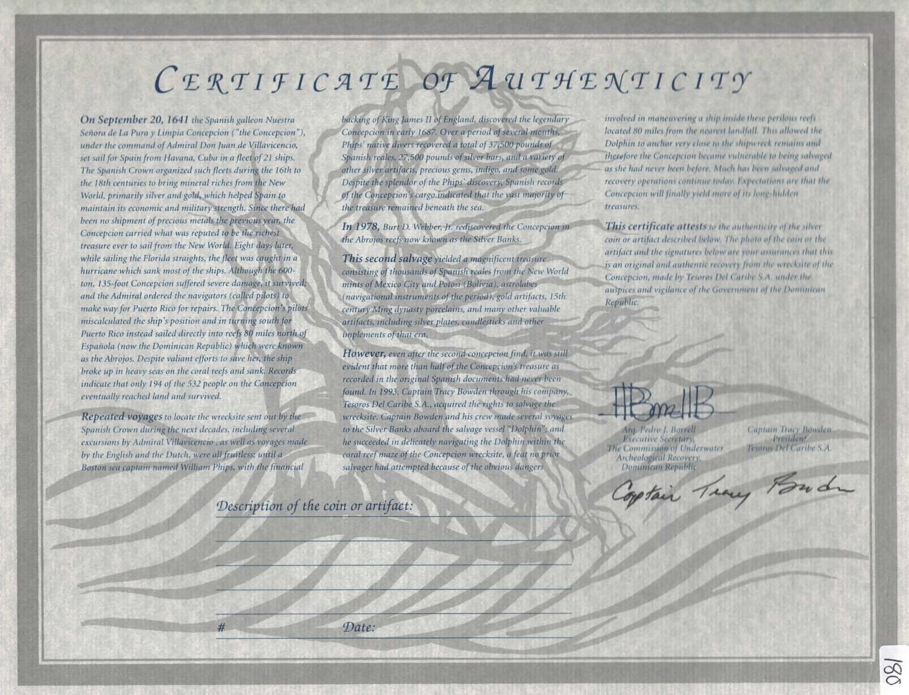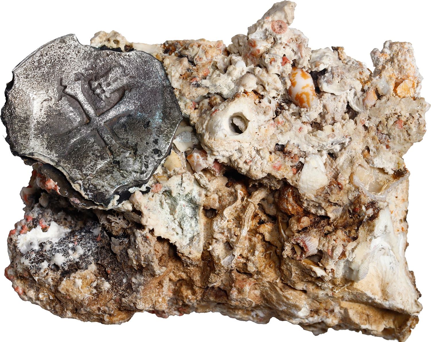 MEXICO, Mexico City, clump of one cob 4 in thick mass of coral, Philip IV, assayer not visible. 112.96 grams total. 3" x 2" x 1¼". Neat display of a corroded yet nearly complete 4 reales showing a bold full cross facing up on a rectangular chunk of rocky coral. With original certificate from Captain Tracy Bowden through his contract with the Dominican Republic. Recovered from: Concepción, sunk in 1641 off Hispaniola