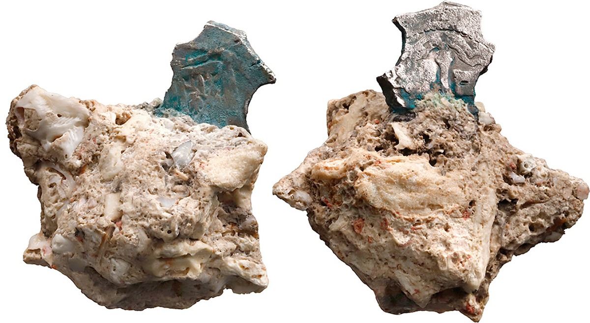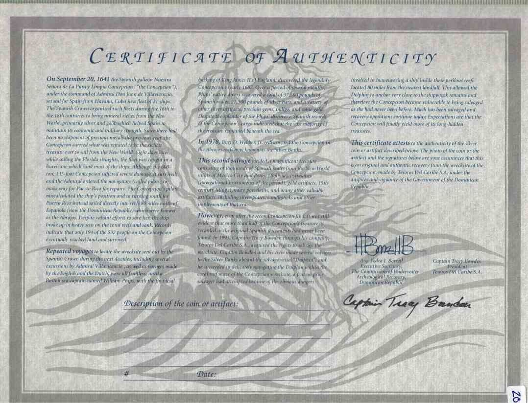 MEXICO, Mexico City, clump of one cob 4 reales fragment in chunk of coral, assayer not visible. 46.27 grams total. roughly 2¼" x 2¼" x 1". Nearly rectangular section of impacted white shells and coral grasping the edge of a corrosion-chewed coin still with clear partial cross and shield and with verdigris on surface, the round-punch edge-loss oddly characteristic of this wreck. With original certificate from Captain Tracy Bowden through his contract with the Dominican Republic. Recovered from: Concepción, sunk in 1641 off Hispaniola