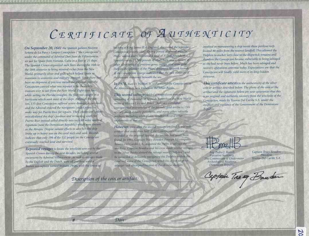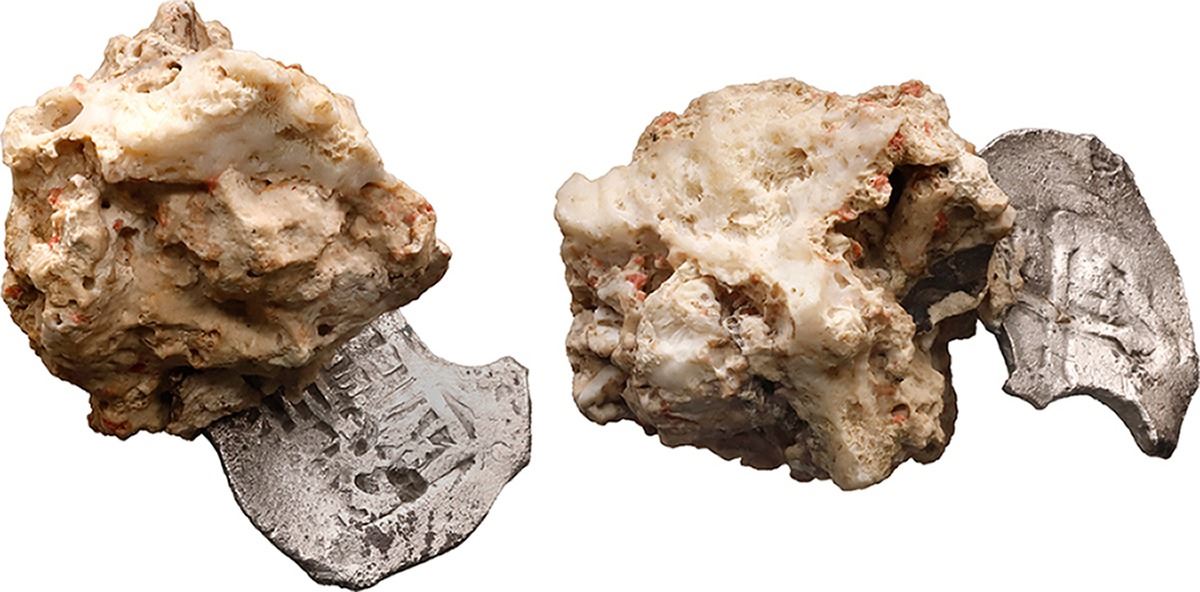 MEXICO, Mexico City, clump of one cob 4 reales in chunk of coral, assayer not visible. 48.74 grams total. roughly 2¼" x 1½" x 1½". A puffy white "rock" of coral with the coin almost floating in mid-air (attached by one small piece), its shield and cross fully visible, with odd circular piece of edge lost to corrosion (rest of coin solid), small but unique and interesting. With original certificate from Captain Tracy Bowden through his contract with the Dominican Republic. Recovered from: Concepción, sunk in 1641 off Hispaniola