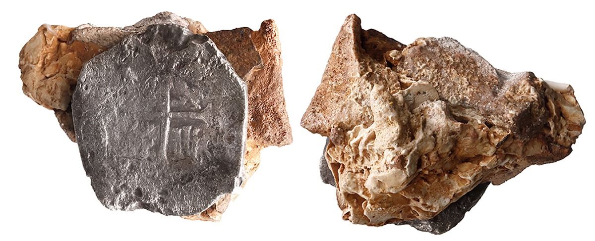 MEXICO, Mexico City, clump of one cob 8 reales and small earthenware shard in chunk of coral, assayer not visible. 55.90 grams total. roughly 2¼" x 2" x 1¼". Great little display with solid coin presented at an angle, face up, on the side of an orange shard encrusted with other debris in tan coral, very neat. With original certificate from Captain Tracy Bowden through his contract with the Dominican Republic. Recovered from: Concepción, sunk in 1641 off Hispaniola