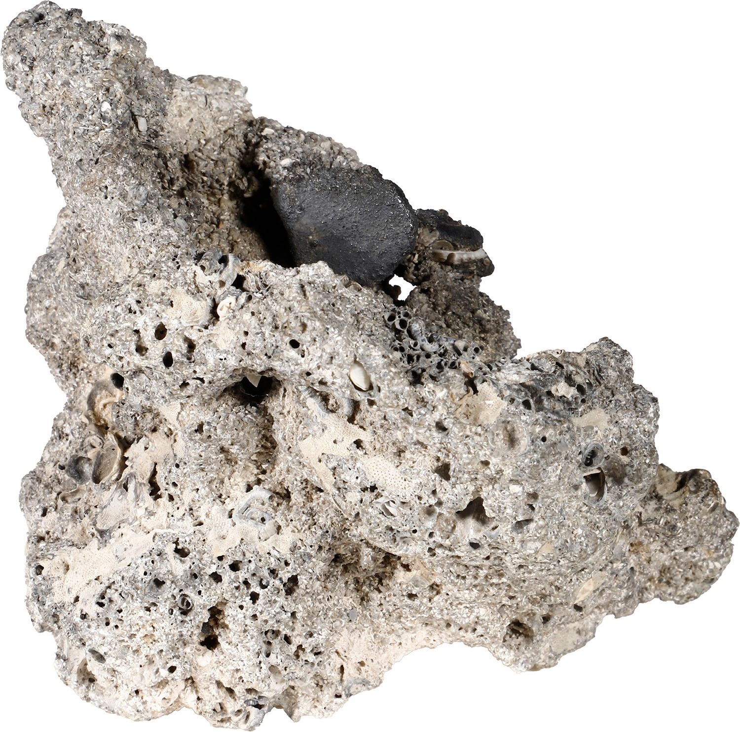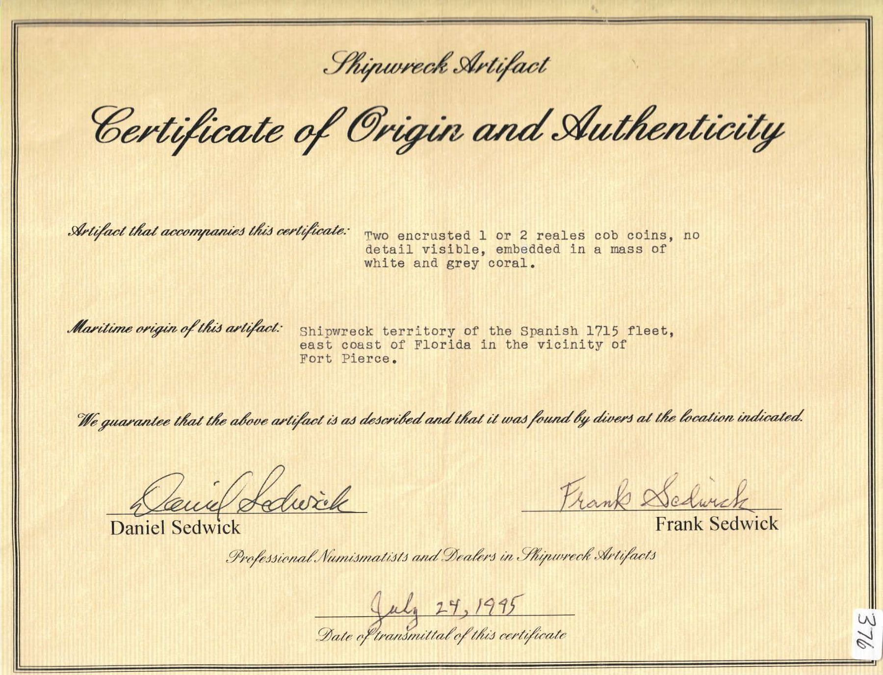 MEXICO, Mexico City, clump of two cob 1R or 2R in large mass of coral. 273 grams total. Roughly 4½" x 3½" x 3". Large gray and white chunk of coral with two dark cobs sticking out on top, numerous sea worm tubes across its surfaces, rare certification. With hand-signed Daniel and Frank Sedwick certificate from 1995. Recovered from: Spanish 1715 Fleet, sunk off the east coast of Florida