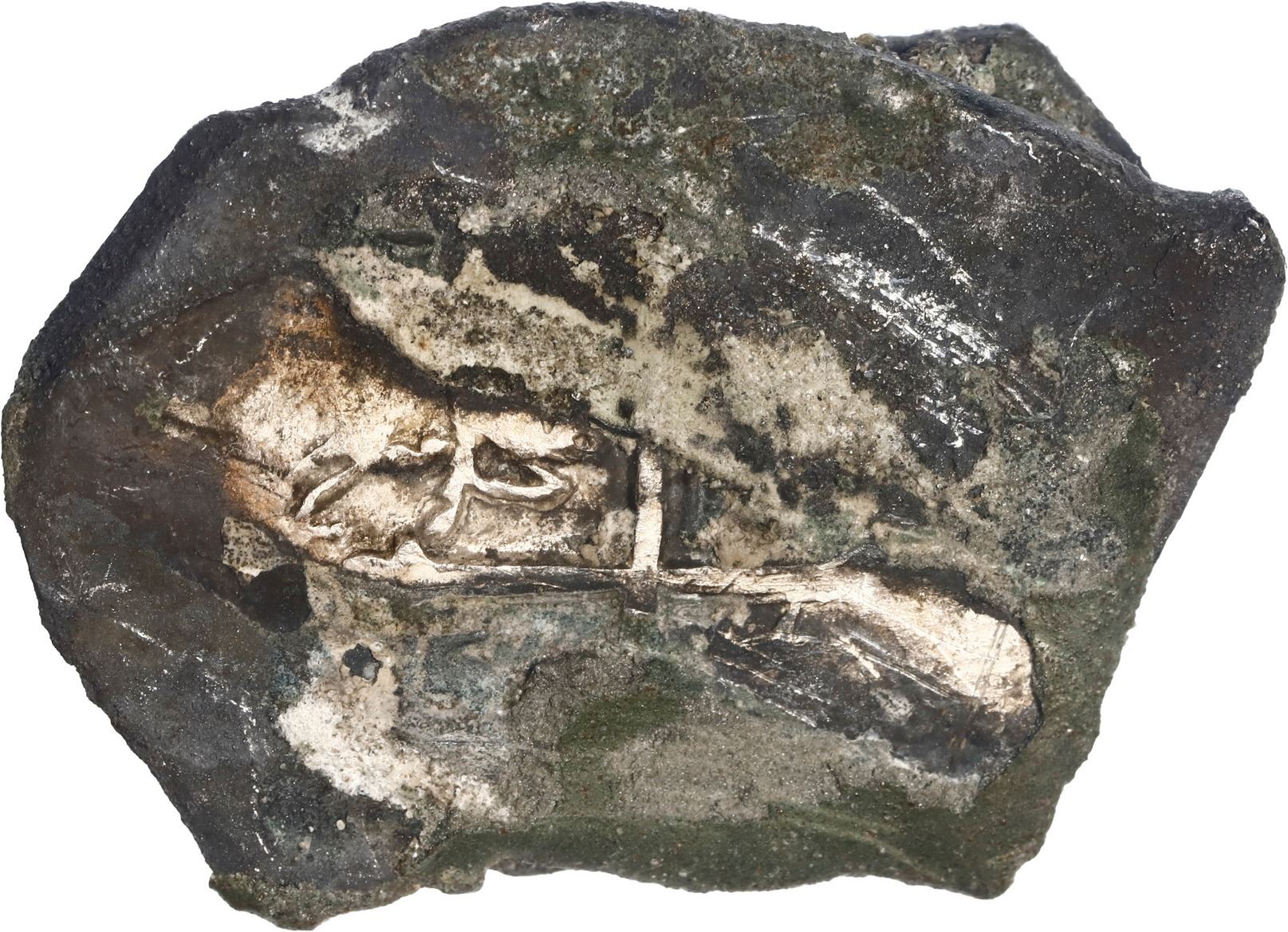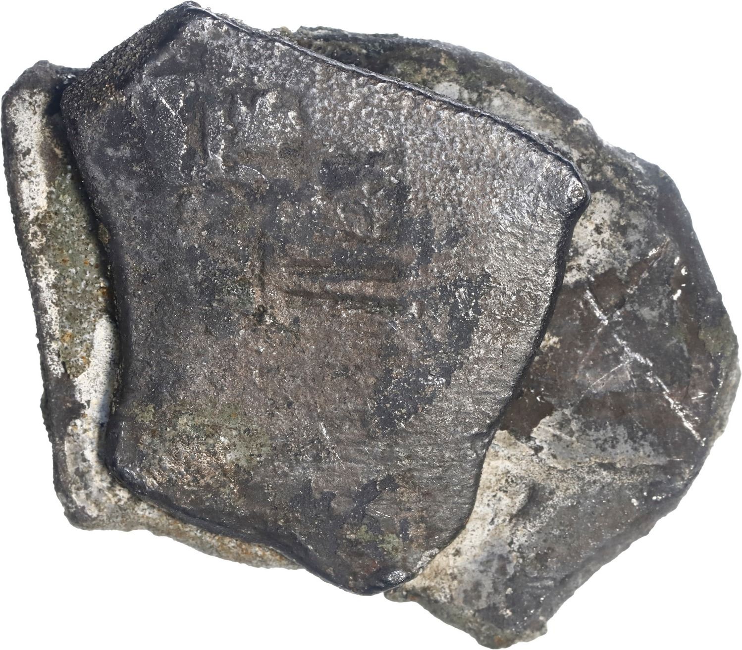 MEXICO, Mexico City, clump of two cobs (one 8 reales and one 4 reales), Philip V, assayer not visible (J), pre-1714 style. 41.09 grams total. Two solid coins, the 4R dark but un-encrusted with shield-side out (1712-13 by style), and the 8R with cross-side out (earlier design), partially cleaned among patches of black and green-gray encrustation. Recovered from: Spanish 1715 Fleet, sunk off the east coast of Florida
