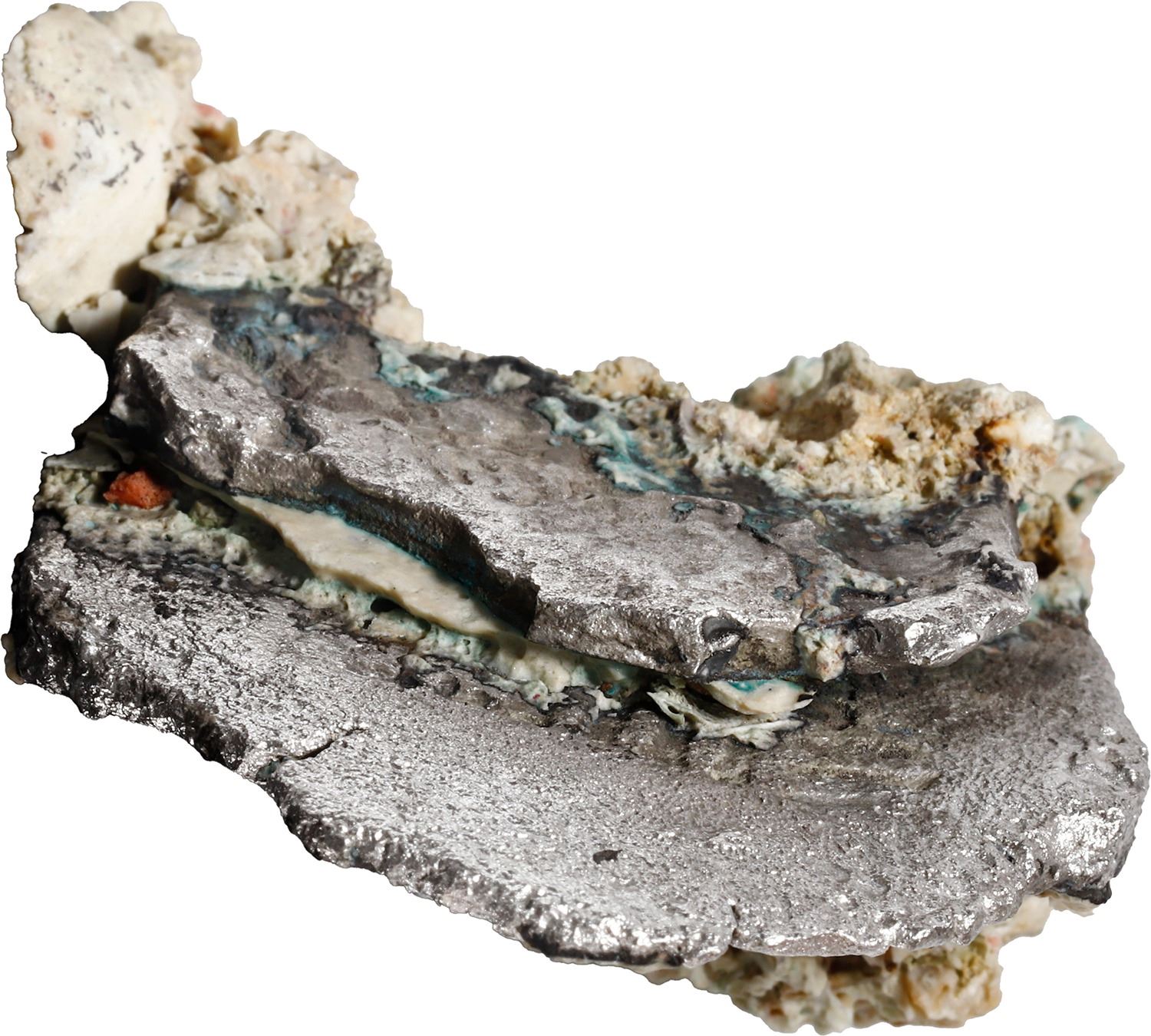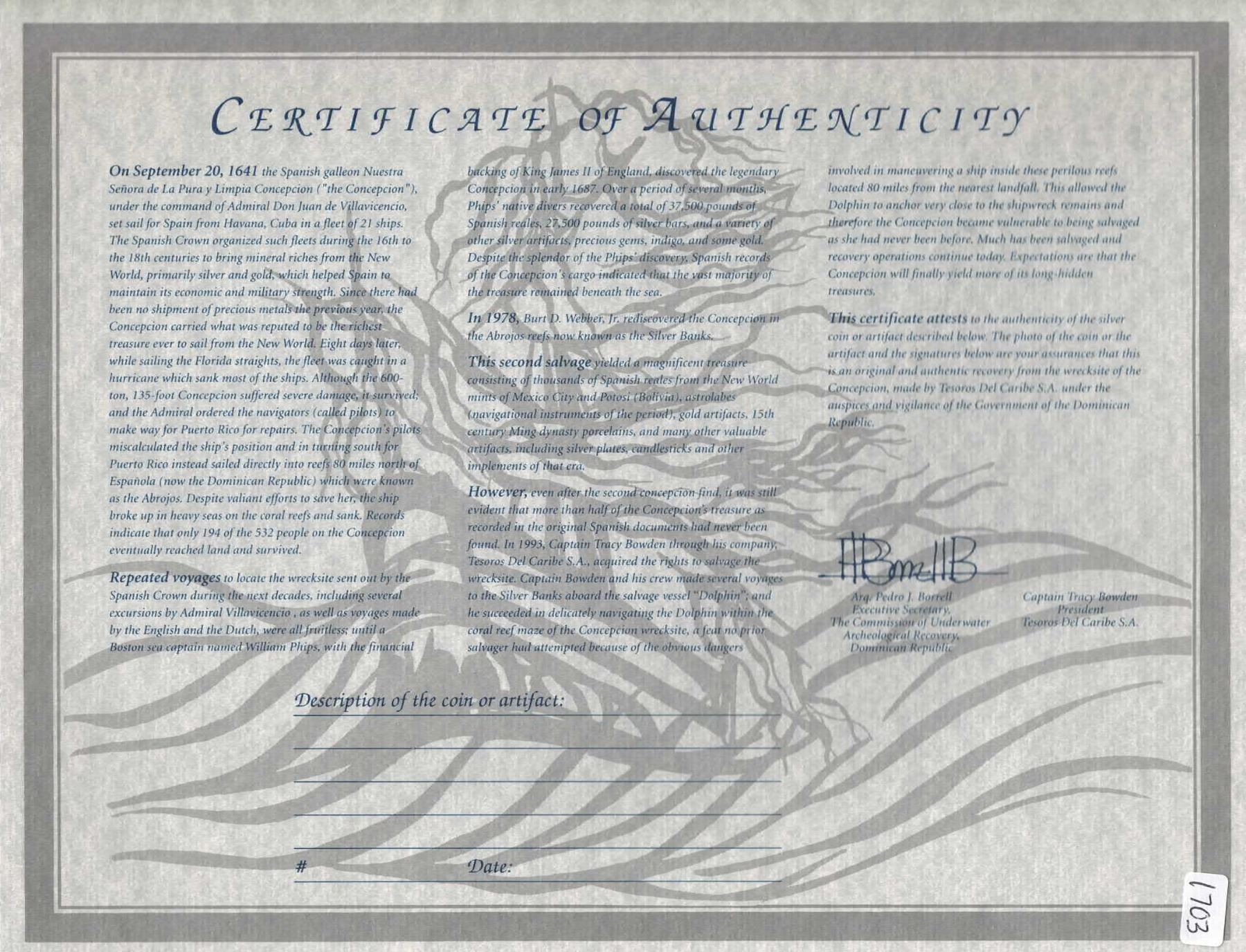 MEXICO, Mexico City, clump of two cobs, one 8 reales and one 4 reales (fragment) in small chunk of coral, Philip IV, assayers not visible. 39.22 grams total. Roughly 2" x 1¾" x 1". Neat little display as found on the wreck site with a silvery, corroded 8 reales connected to lumps of coral on the edge plus a heavily corroded chunk of a second coin underneath. With original certificate from Captain Tracy Bowden through his contract with the Dominican Republic. Recovered from: Concepción, sunk in 1641 off Hispaniola