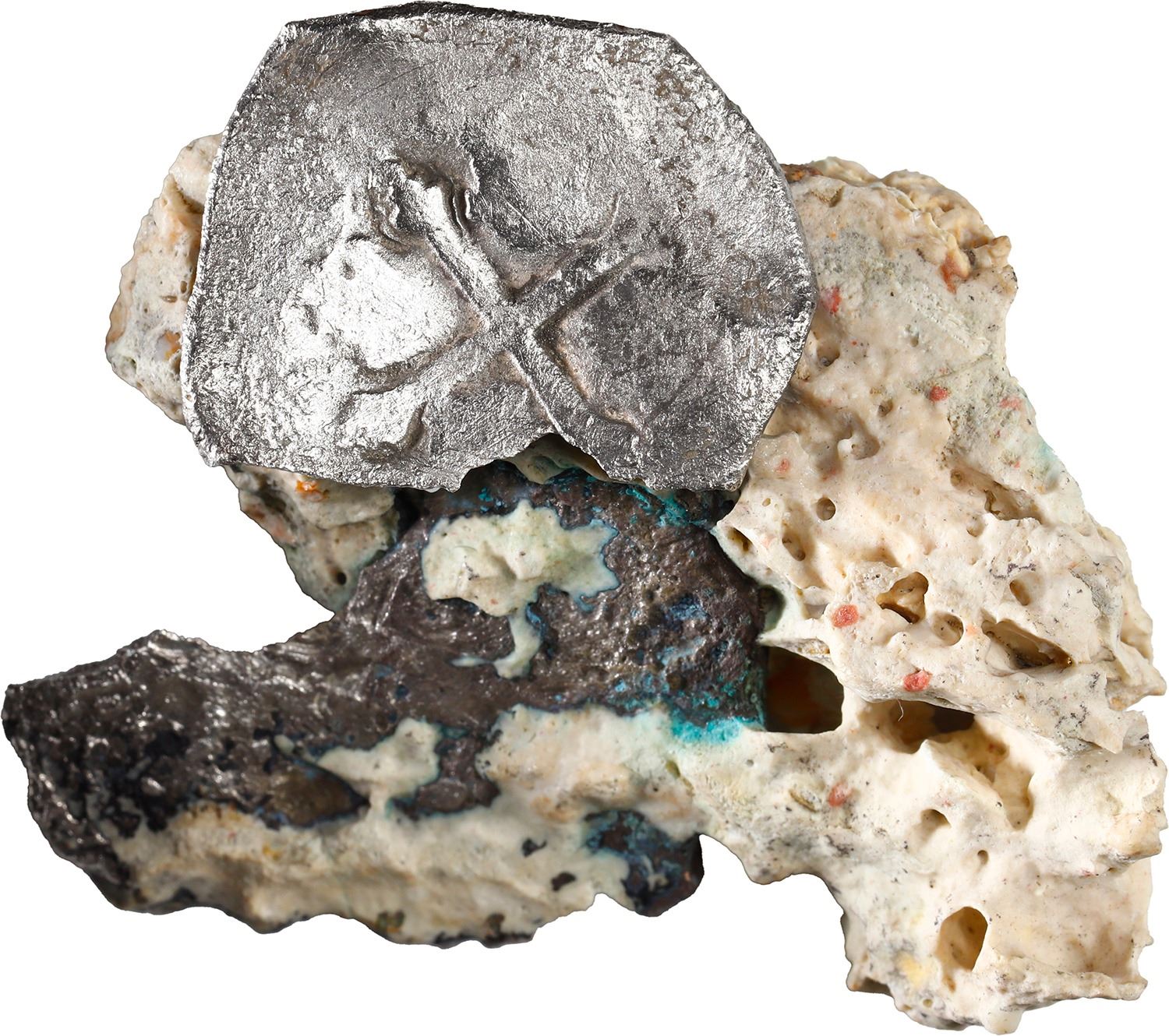 MEXICO, Mexico City, clump of two cobs, one 8 reales (fragment) and one 4 reales, in mass of coral,