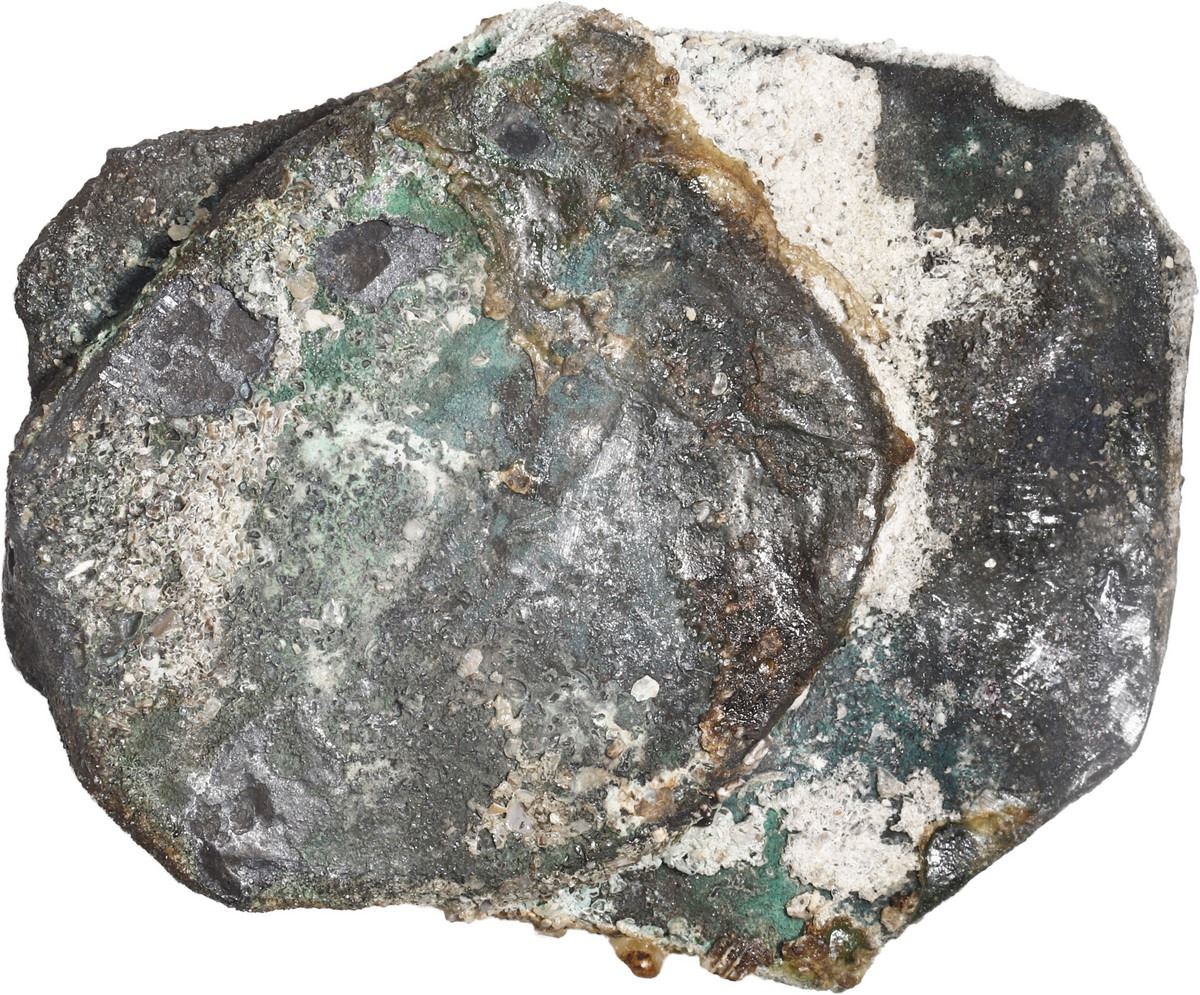 MEXICO, Mexico City, clump of two cobs (one 8R and one 4R), probably Philip V, assayers not visible, encrusted as found. 41.46 grams total. Tight stack with unidentifiable 4R fused to one end of an 8R with part of other side cleaned to reveal an old-style cross, otherwise coated in white, green, and tan encrustation. Pedigreed to Sedwick Auction 20, with original lot-tag 842. Recovered from: Spanish 1715 Fleet, sunk off the east coast of Florida