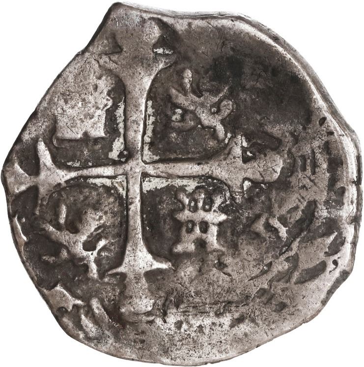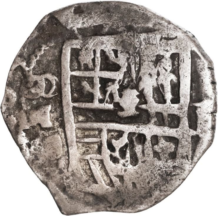 MEXICO, Mexico City, cob 1 real, 163(?) D, rare, ex-Hubbard. S-M18a; KM-28; Cal-Type 199. 3.28 grams. Full but off-center cross, nearly full shield with bold oMD (the o triple-punched) inside clear bottom of 163 of date, the final digit unclear (only 0, 1, 2, or 3 are possible, all of which are quite rare), nicely toned F/VF. Pedigreed to the Clyde Hubbard Collection, with his tag.