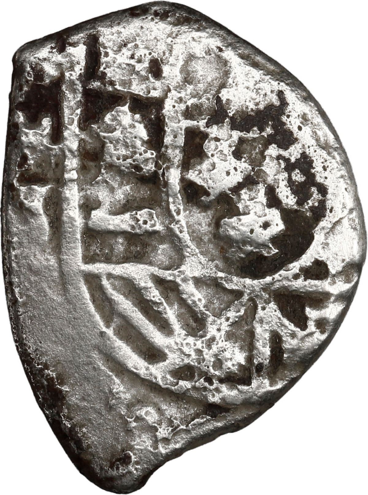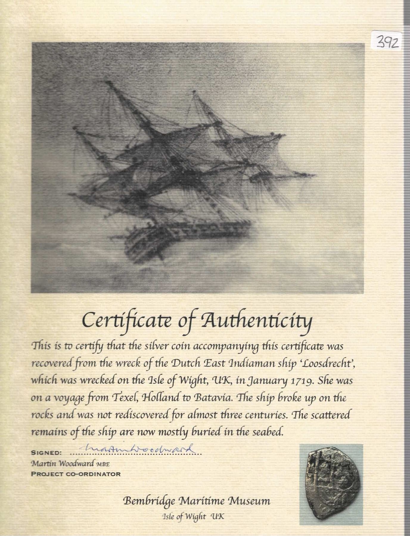 MEXICO, Mexico City, cob 1 real, (1712-14) J. S-M22; KM-30; Cal-Type 77. 2.38 grams. Bold strike with nearly full shield showing clear oMJ to left, the cross also nearly full, some surface corrosion with a few black spots, scarce provenance for this type. With original photo-certificate from the salvor. Recovered from: Loosdrecht, sunk in 1719 off the Isle of Wight, south of England