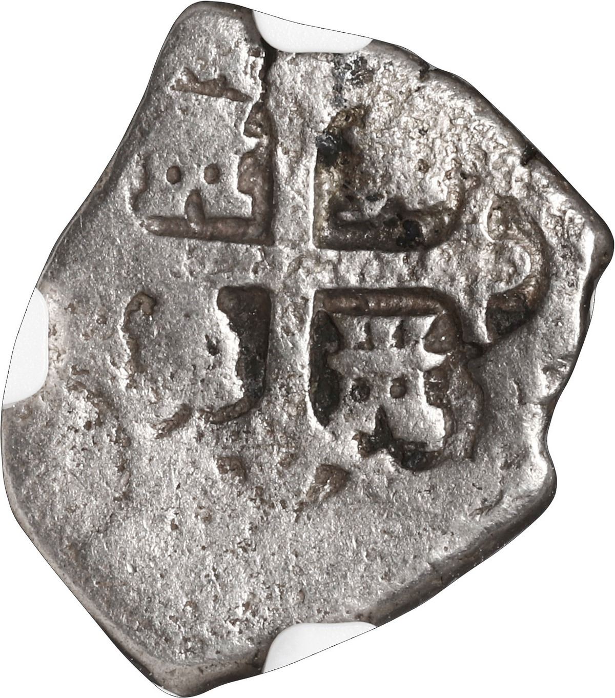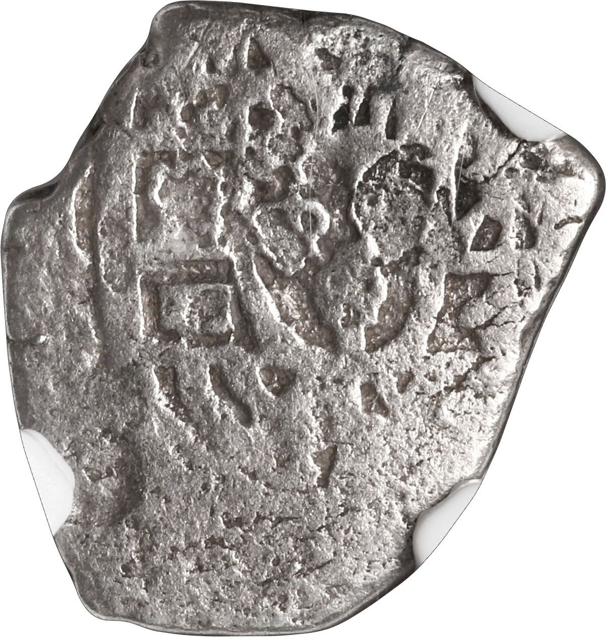 MEXICO, Mexico City, cob 1 real, (1724) D, rare, NGC VG details / sea salvaged (Shipwreck Blue Label). S-unl; KM-unl (30 for type); Cal-unl (Type 77). 2.54 grams. Nearly full cross and shield showing "floating fesse" in Austria indicative of pre-1725 issue, with weak but certain assayer D (not mentioned on label), which began in 1724 (hence that is the only year this could be), some surface pitting but nicely toned. Recovered from: HMS Assurance, sunk in 1753 off Isle of Wight, south of England