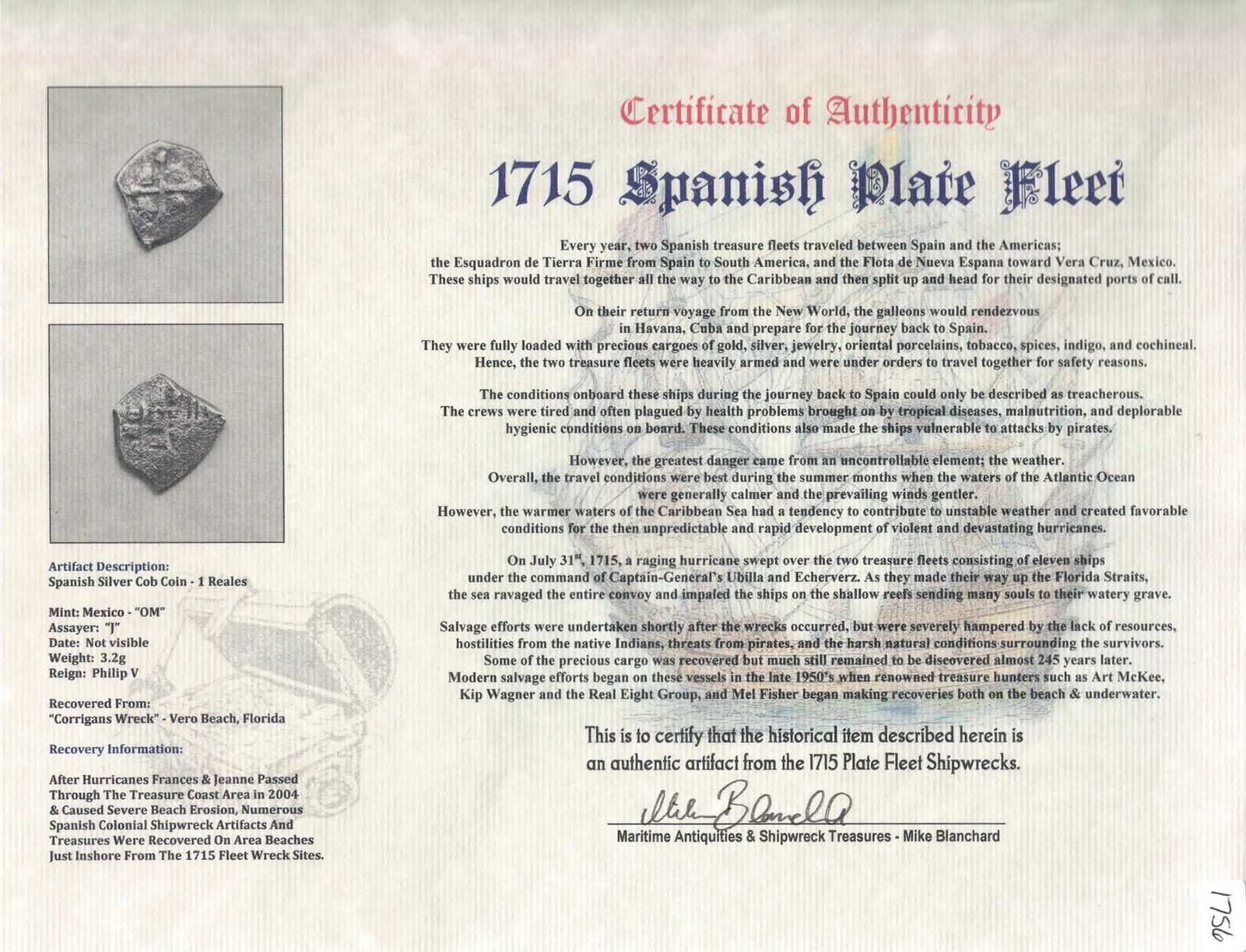 MEXICO, Mexico City, cob 1 real, Philip V, assayer J. S-M22; KM-30; Cal-Type 77. 3.15 grams. Corroded yet solid with clear mintmark and just enough of the assayer, well-centered cross. From the Corrigan's site, with photo-certificate. Recovered from: Spanish 1715 Fleet, sunk off the east coast of Florida