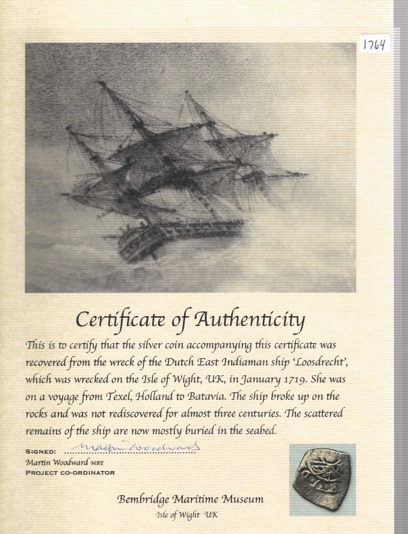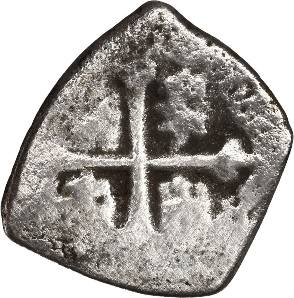 MEXICO, Mexico City, cob 1 real, Philip V, assayer not visible. KM-30; Cal-Type 77. 2.11 grams. Lightly corroded yet with nice details including a bold king's ordinal V below shield, nearly complete cross, silvery surfaces with minor corrosion. With original photo-certificate from the salvor. Recovered from: Loosdrecht, sunk in 1719 off the Isle of Wight, south of England