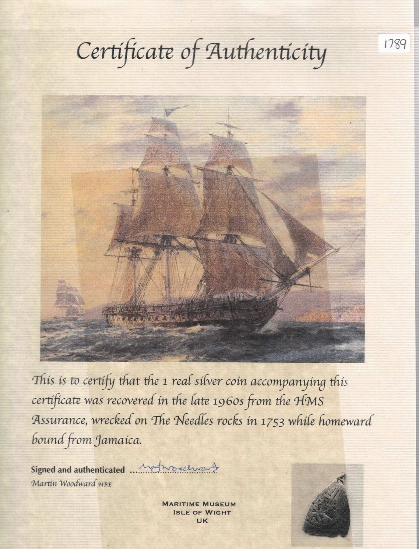 MEXICO, Mexico City, cob 1 real, Philip V, assayer not visible. KM-30; Cal-Type 77. 2.85 grams. VF with minor corrosion, bold partial shield and cross, sharp edges, scarce shipwreck provenance. With original photo-certificate from the salvor. Recovered from: HMS Assurance, sunk in 1753 off Isle of Wight, south of England