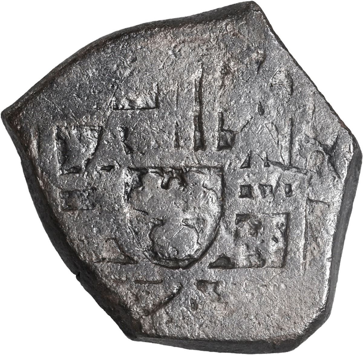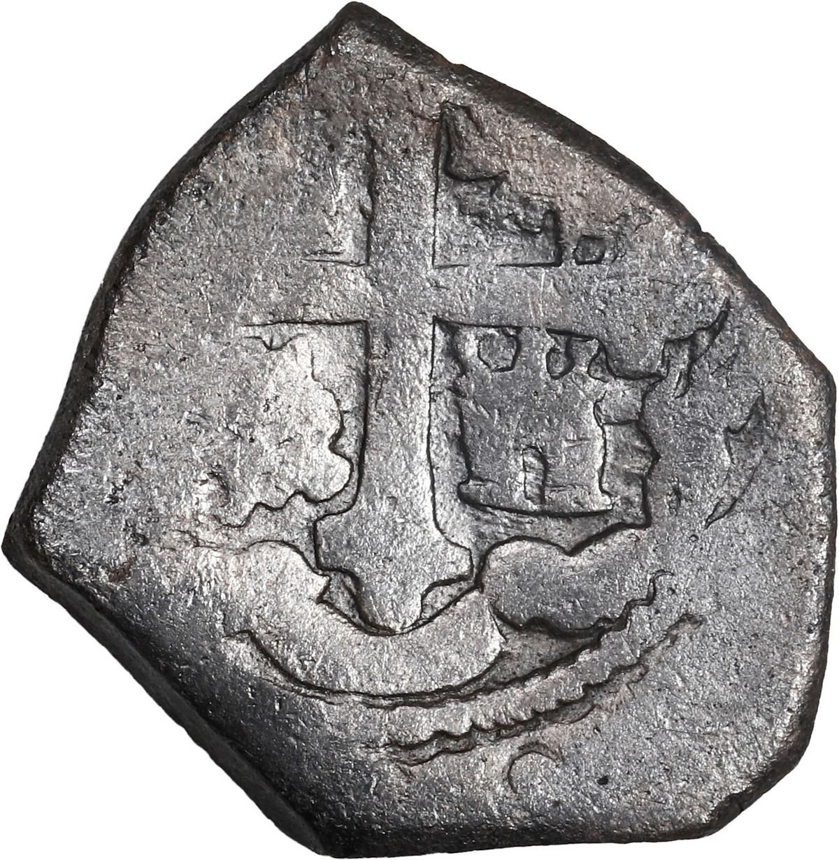 MEXICO, Mexico City, cob 2 reales, (1705-12) (J). S-M22; KM-35; Cal-Type 109. 6.45 grams. Solid cob with dark surfaces, nice bold partial cross and shield, very little corrosion to note. Recovered from: Spanish 1715 Fleet, sunk off the east coast of Florida