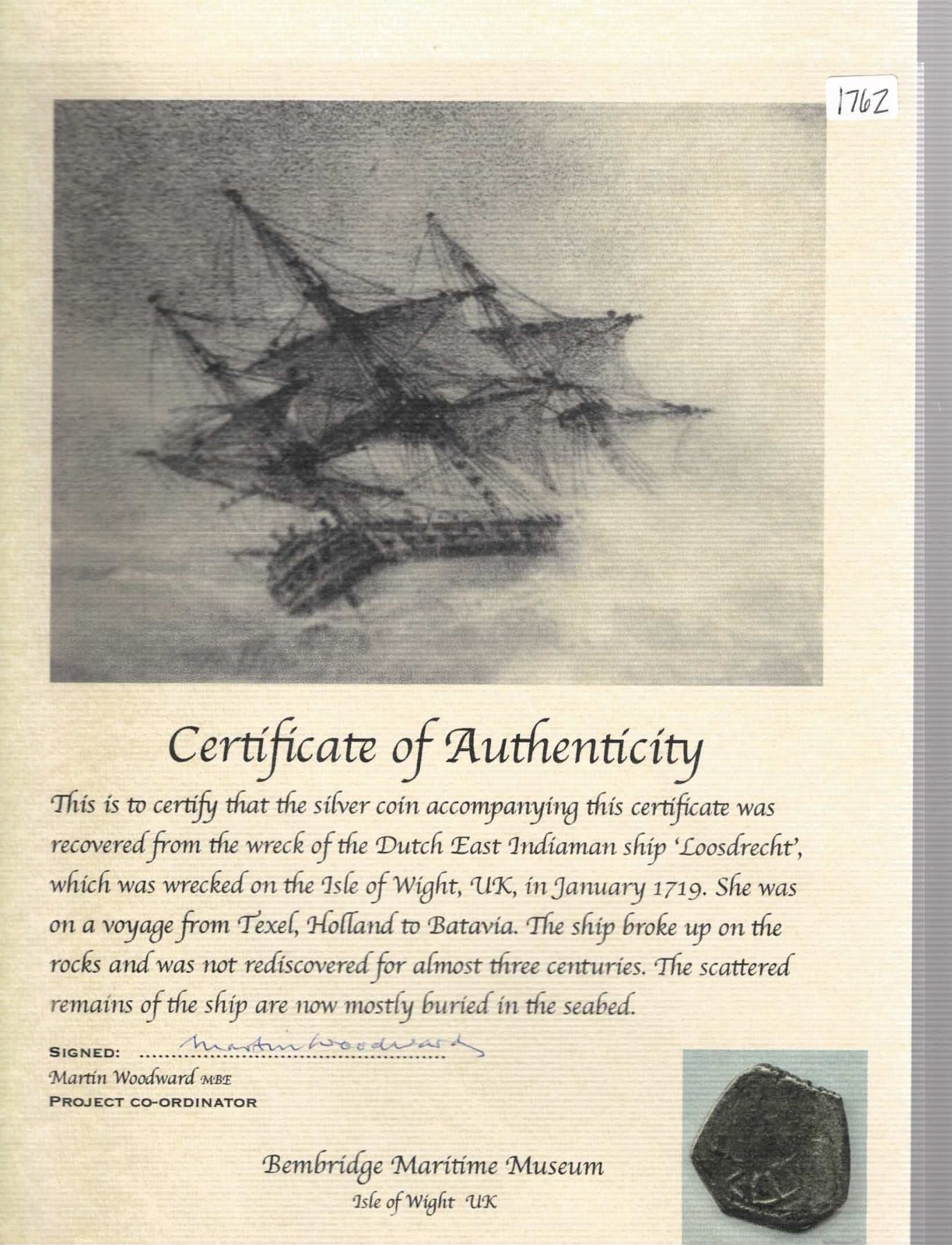 MEXICO, Mexico City, cob 2 reales, Philip V, assayer not visible. KM-35; Cal-109. 5.41 grams. Desirable provenance, dull gray surfaces with mild corrosion, weak shield, partial cross. With original photo-certificate from the salvor. Recovered from: Loosdrecht, sunk in 1719 off the Isle of Wight, south of England