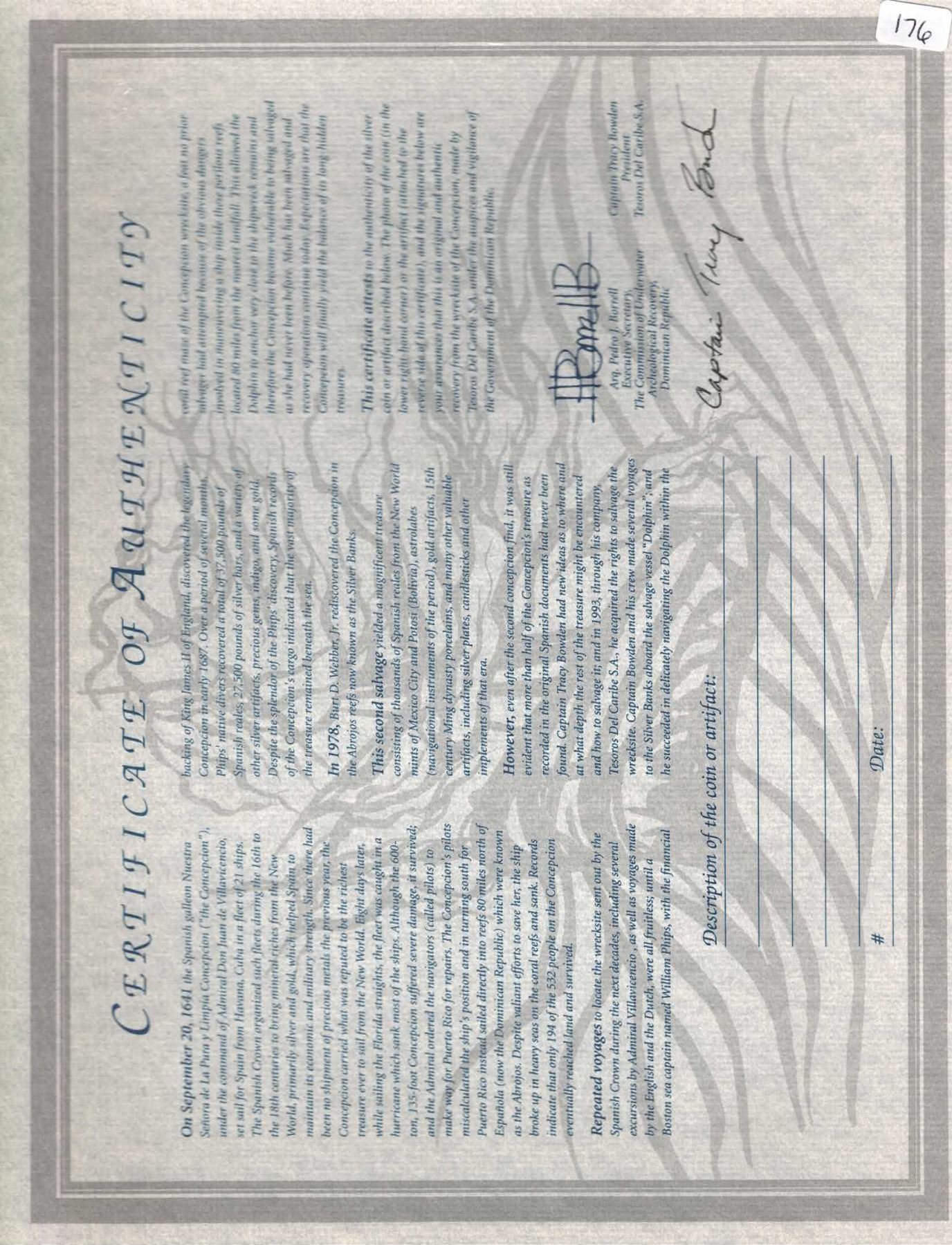 MEXICO, Mexico City, cob 4 reales, 1632 (D), extremely rare. S-M18a; KM-38; Cal-1060. 13.22 grams. Bold full final digit Z and most of 3 of date in otherwise flat periphery, some shield and cross, minimal corrosion, hairline edge-split, nice toning. With original certificate from Captain Tracy Bowden through his contract with the Dominican Republic. Recovered from: Concepción, sunk in 1641 off Hispaniola