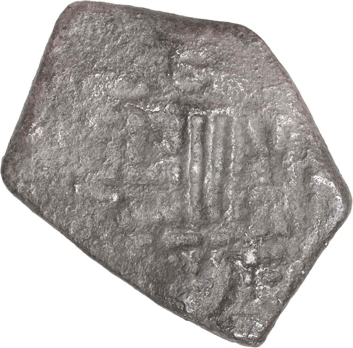 MEXICO, Mexico City, cob 4 reales, Charles II, assayer not visible, ex-Sotheby's. KM-39; Cal-Type 91. 7.54 grams. Sharply five-sided flan with most of shield and cross despite moderate to heavy corrosion and dark, low-contrast toning, desirable with original auction pedigree. Pedigreed to the Sotheby & Co. (London) Association auction of January 1970, with original lot-tag 161 (group lot). Recovered from: Association, sunk in 1707 off the Isles of Scilly, south west of England