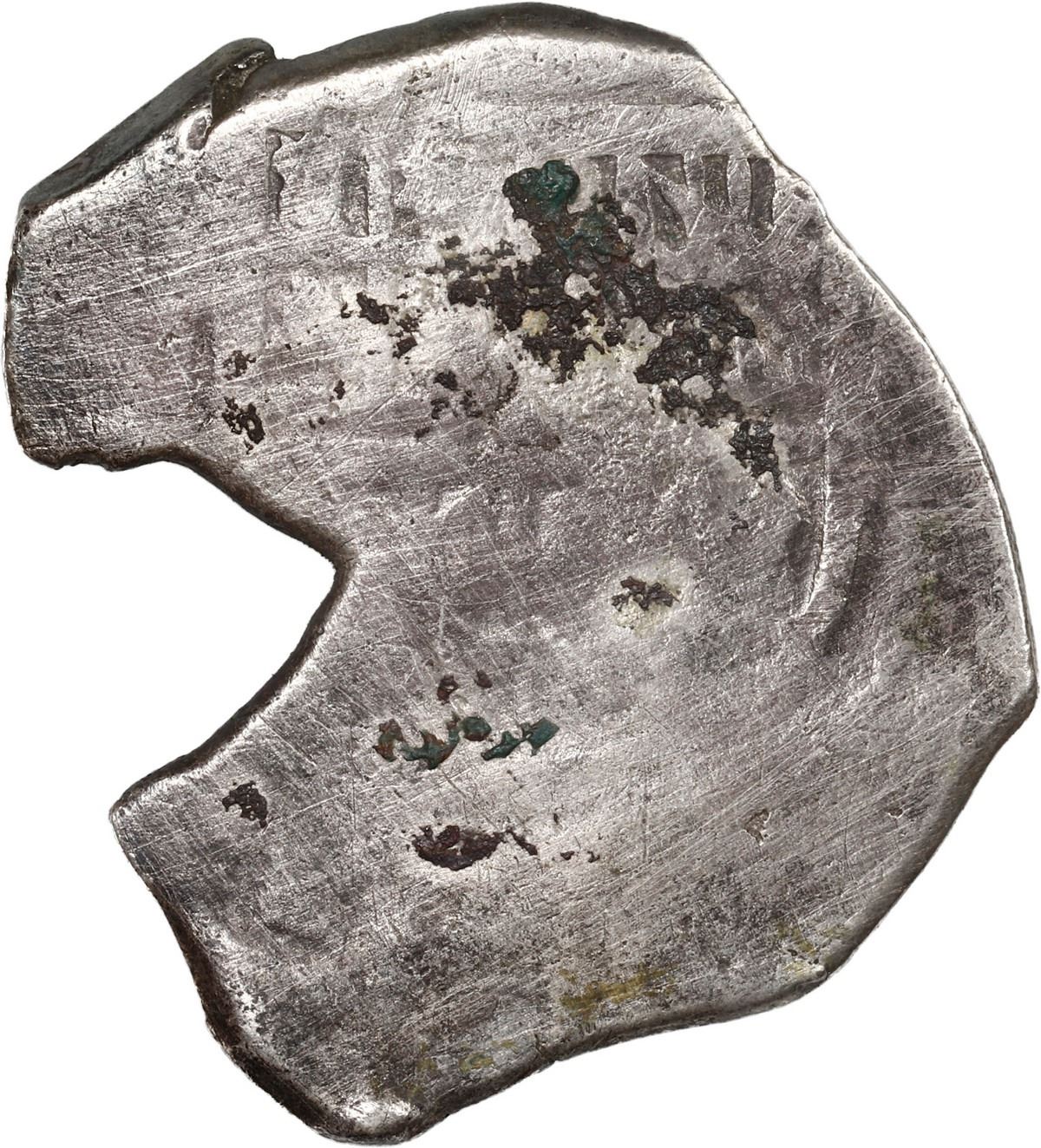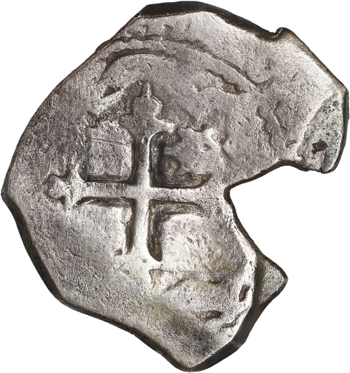 MEXICO, Mexico City, cob 4 reales, Charles II, assayer not visible, neat shape. KM-39; Cal-Type 91. 13.27 grams. Roundish flan with large notch (as made), full cross and shield (the latter weak) with light toning, spots of dark "horn silver" over lightly corroded surfaces. Recovered from: Joanna, sunk in 1682 off South Africa