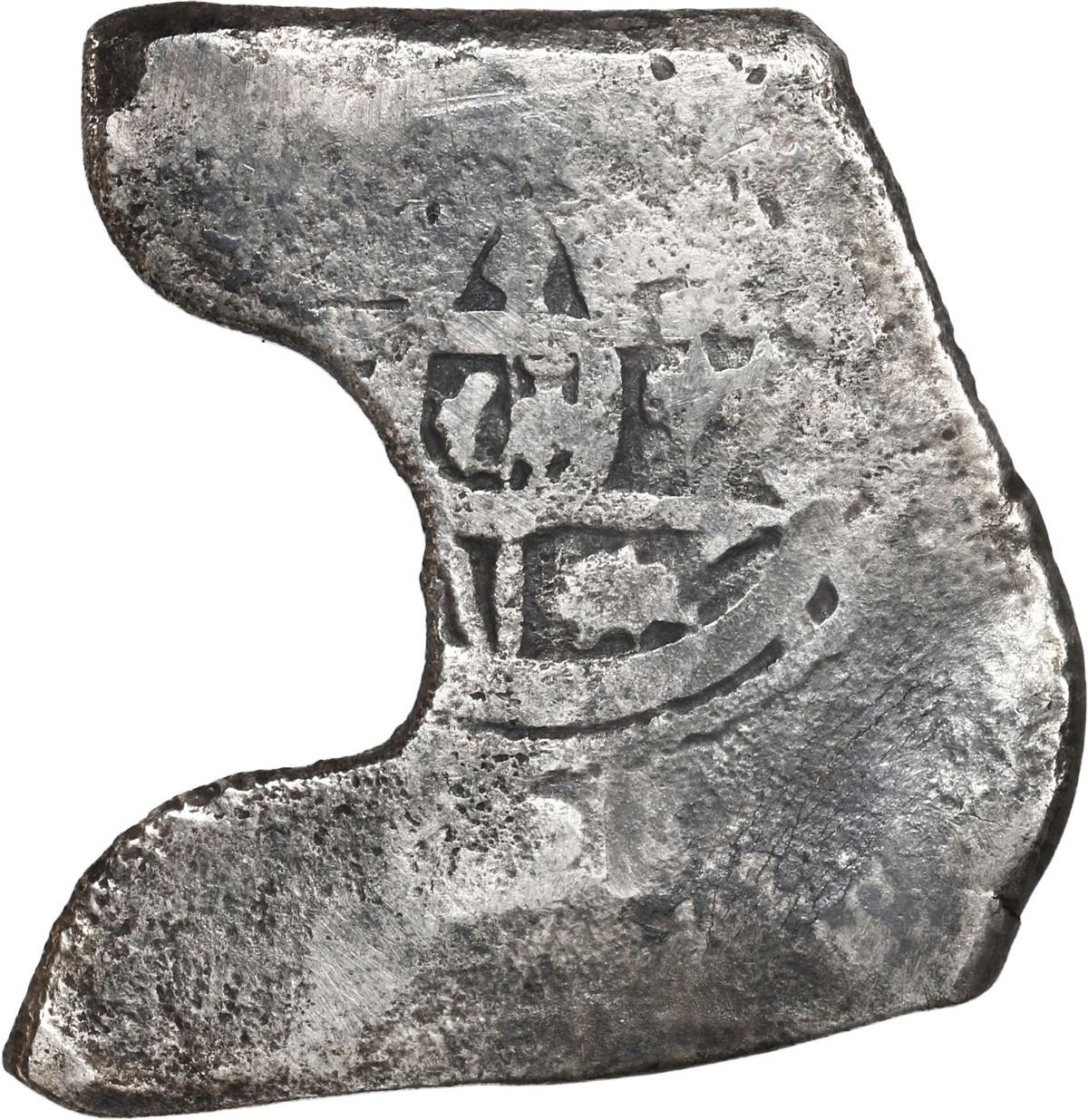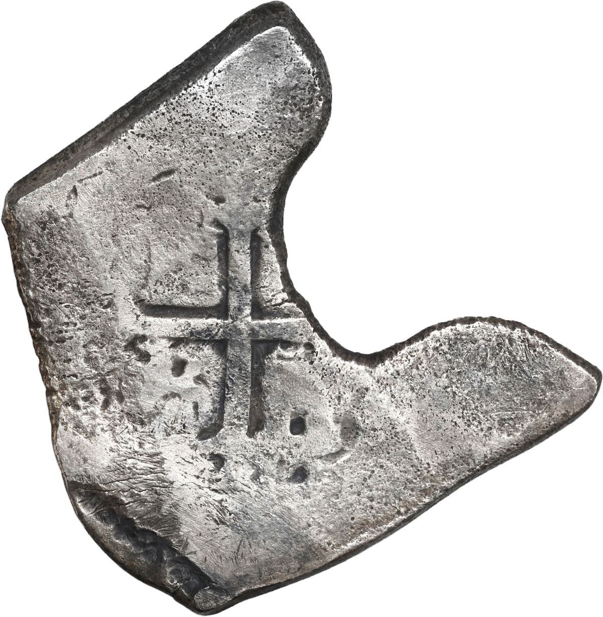 MEXICO, Mexico City, cob 4 reales, Charles II, assayer not visible, neat shape. KM-39; Cal-Type 91. 11.98 grams. Squarish flan with two "arms" around a large void (as made), most of cross, some shield, peripherally flat but not overly corroded, mostly toned. Recovered from: Joanna, sunk in 1682 off South Africa