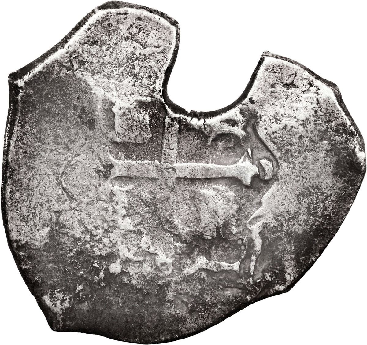 MEXICO, Mexico City, cob 4 reales, Charles II, assayer not visible, neat shape. KM-39; Cal-Type 91. 12.68 grams. Roundish flan with large notch from bubble in metal, some corrosion but overall more solid than most from this wreck, some cross and shield (peripheries flat), rich brown toning. Recovered from: Joanna, sunk in 1682 off South Africa