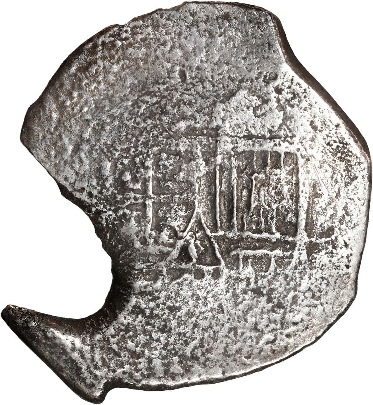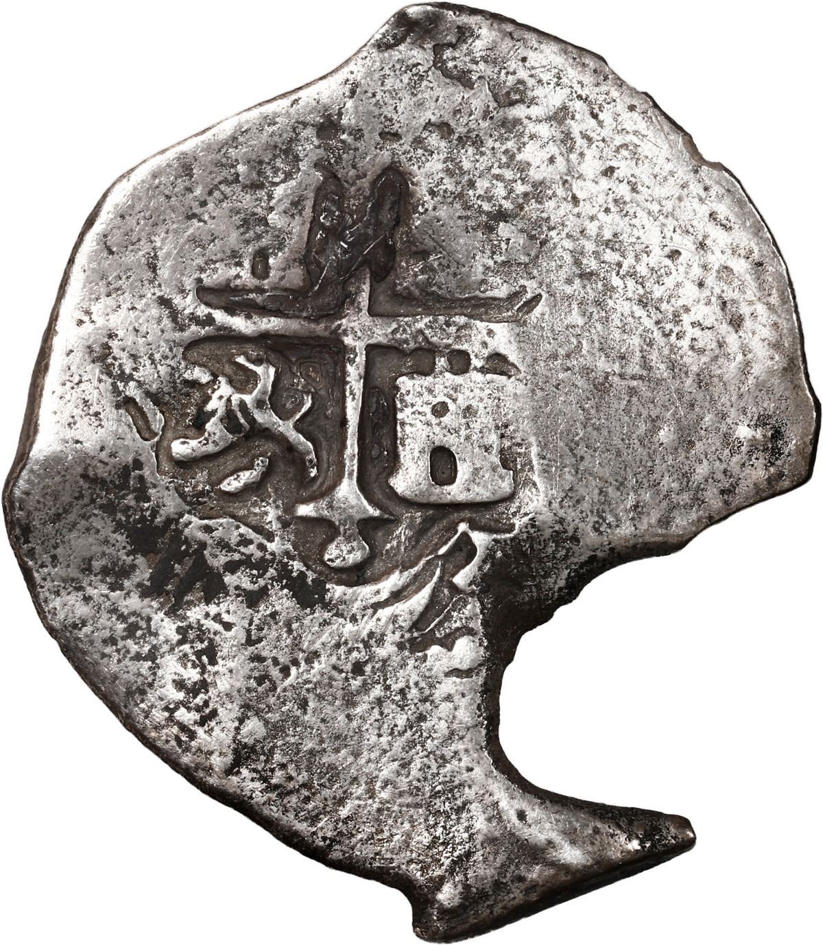MEXICO, Mexico City, cob 4 reales, Charles II, assayer not visible, neat shape. KM-39; Cal-Type 91. 9.99 grams. Roundish flan with curiously fluked tail, full cross and most of shield within flat peripheries, typically corroded, lightly toned. Recovered from: Joanna, sunk in 1682 off South Africa
