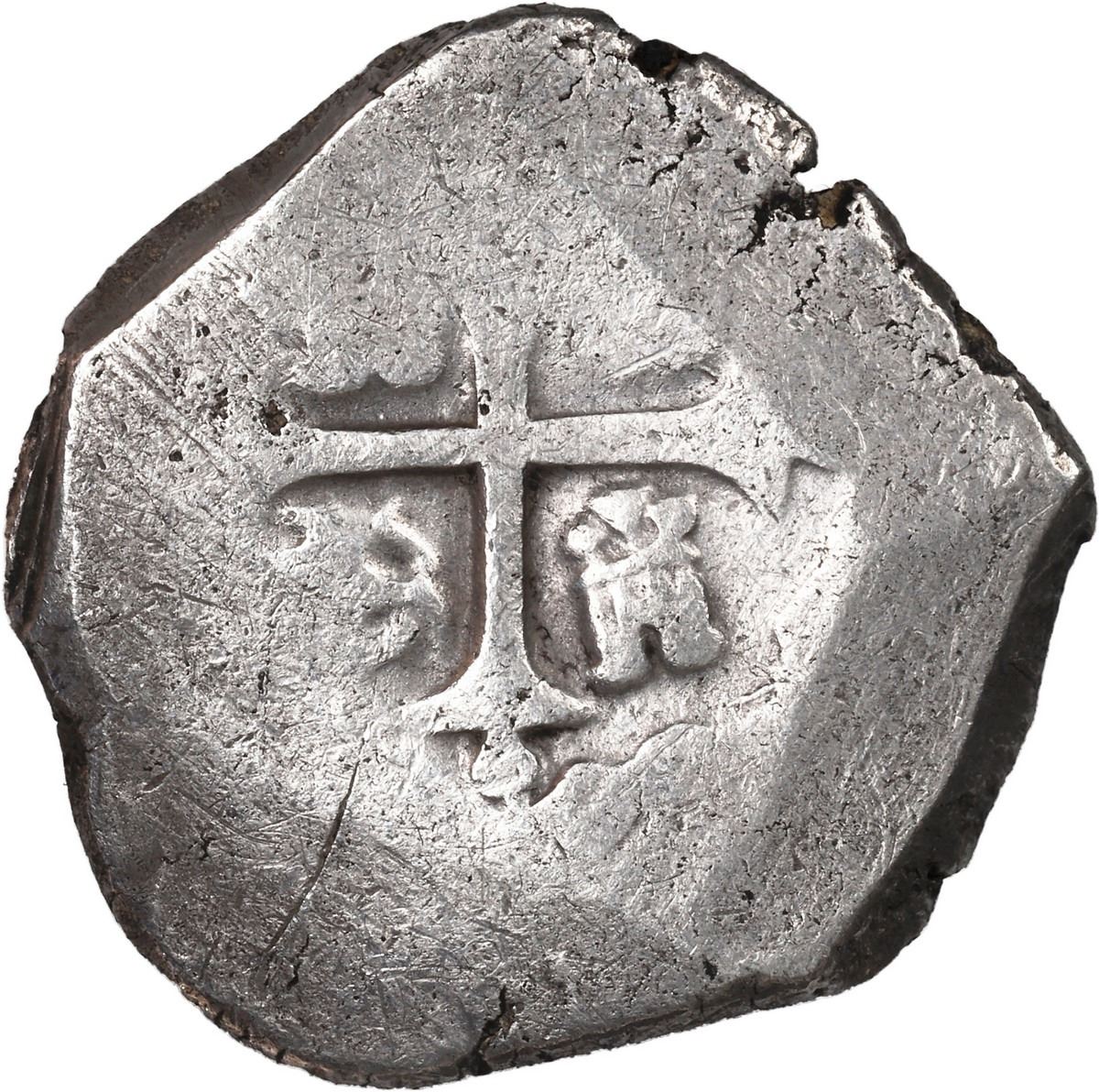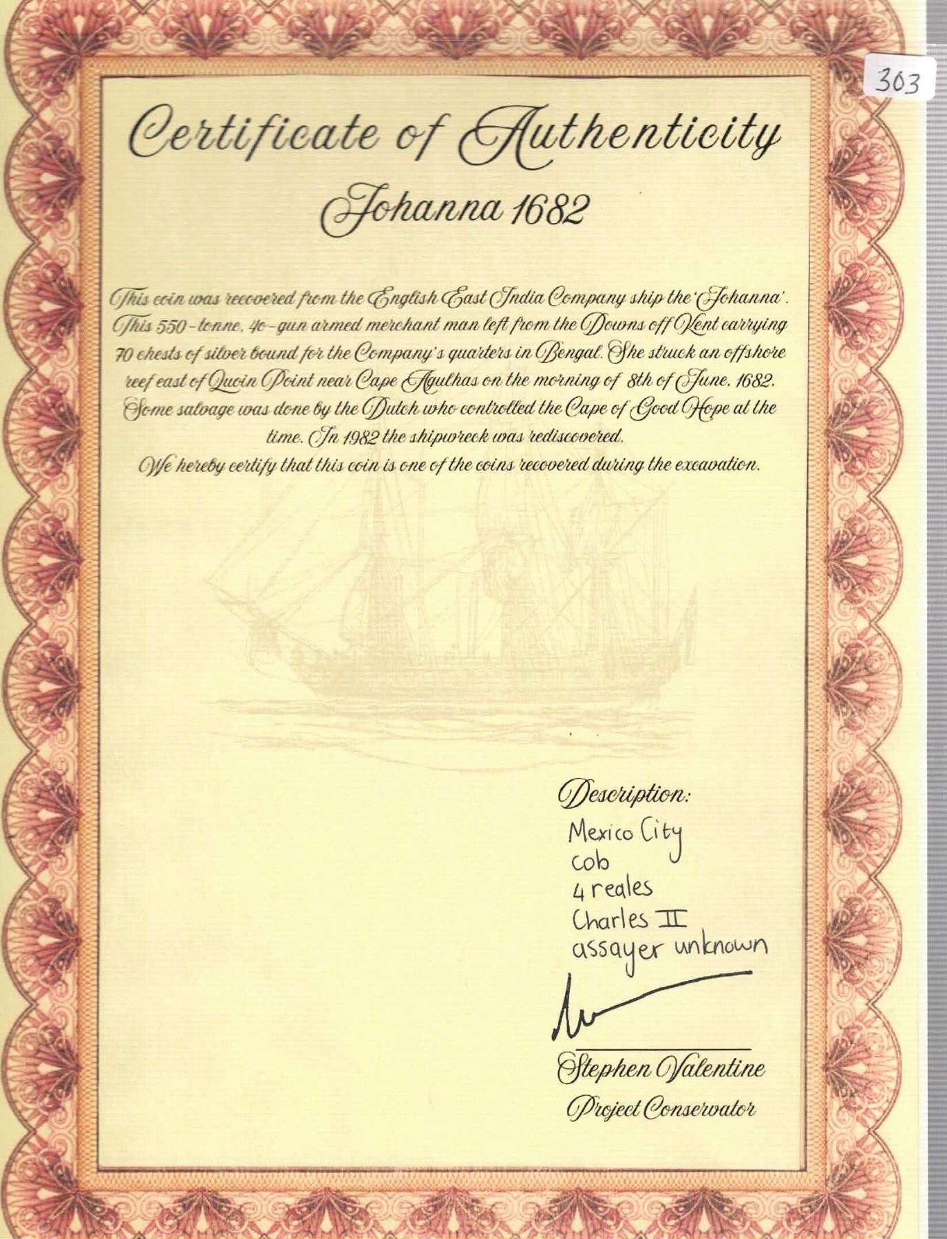 MEXICO, Mexico City, cob 4 reales, Charles II, assayer not visible. KM-39; Cal-Type 91. 13.27 grams. Thick, roundish flan with no corrosion (rare for this wreck) but rather flat in peripheries, most of cross and some shield still visible, very lightly toned. Pedigreed to the Steve Valentine Collection, with original certificate from the salvor/conservator. Recovered from: Joanna, sunk in 1682 off South Africa