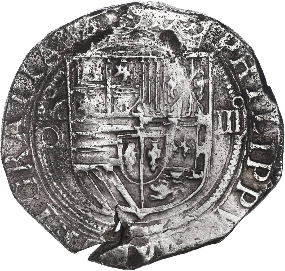 MEXICO, Mexico City, cob 4 reales, Philip II, assayer O below mintmark oM to left. S-M11; KM-36; Cal-505. 13.33 grams. Choice full shield and cross, much legend including full PHILIPPVS in legend, nicely toned, one crude edge-split but practically no corrosion. Pedigreed to the Steve Valentine Collection, with original certificate from the salvor/conservator. Recovered from: Santiago, sunk in 1585 off Bassas da India in the Indian Ocean