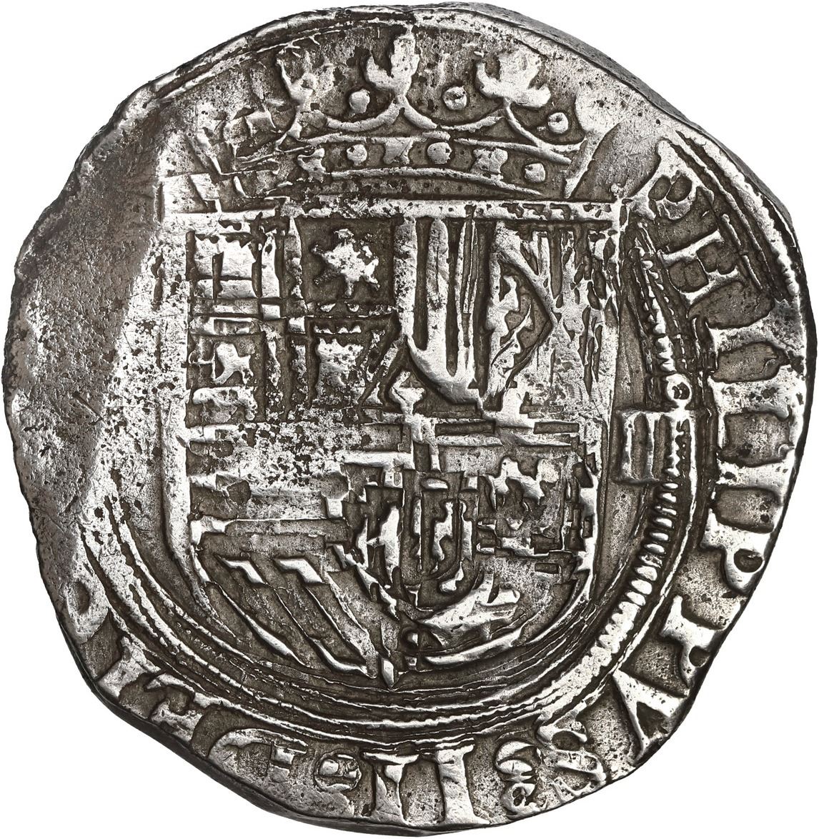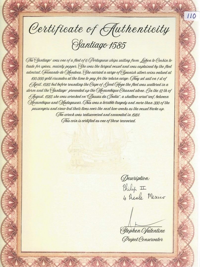 MEXICO, Mexico City, cob 4 reales, Philip II, assayer not visible (O) below mintmark oM to left. S-M11; KM-36; Cal-505. 13.37 grams. Good full shield and cross, choice full crown and much legend including full PHILIPPVS II, no toning, practically no corrosion. Pedigreed to the Steve Valentine Collection, with original certificate from the salvor/conservator. Recovered from: Santiago, sunk in 1585 off Bassas da India in the Indian Ocean