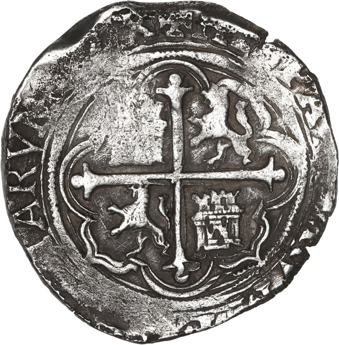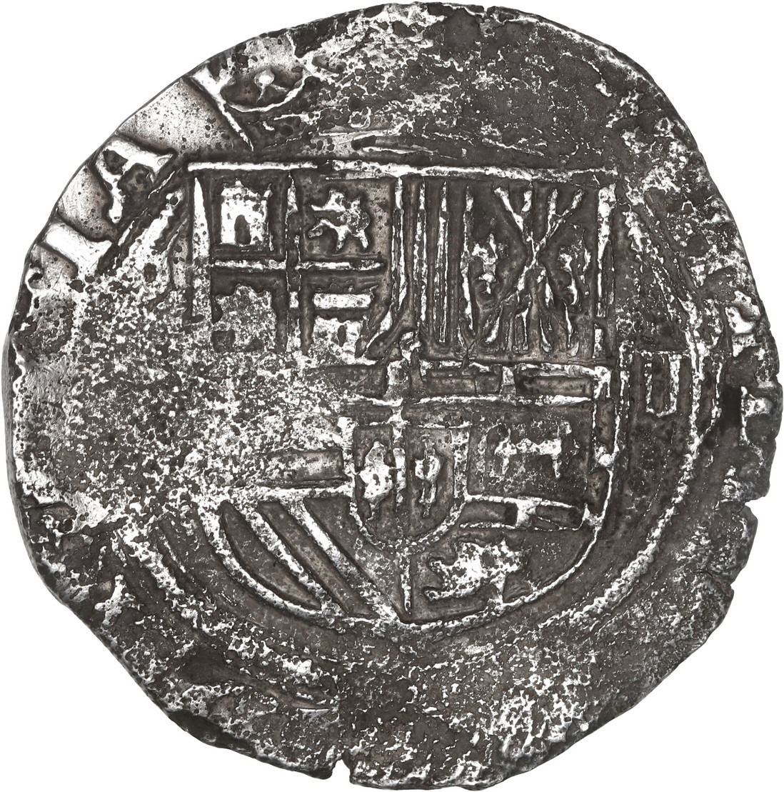MEXICO, Mexico City, cob 4 reales, Philip II, assayer not visible (O below oM to left), denomination o-IIII to right. S-M11; KM-36; Cal-505. 13.10 grams. XF details with mildly corroded obverse though shield is nearly complete, rather nice and practically untouched reverse with full cross and partial legends. Pedigreed to the Steve Valentine Collection, with original certificate from the salvor/conservator. Recovered from: Santiago, sunk in 1585 off Bassas da India in the Indian Ocean