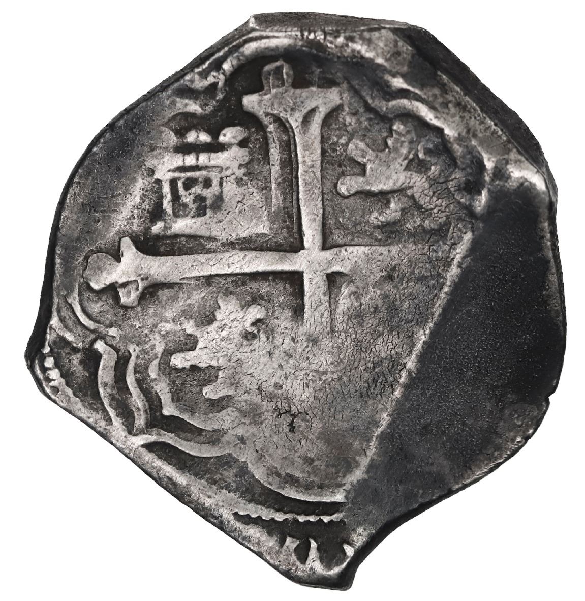 MEXICO, Mexico City, cob 4 reales, Philip IV, assayer D. S-M18a; KM-38; Cal-Type 275. 13.00 grams. Full oMD, much flatness (some shield and most of cross) but practically no corrosion, uneven dark toning. Recovered from: "Lucayan Beach Wreck," sunk ca. 1628 off Grand Bahama Island