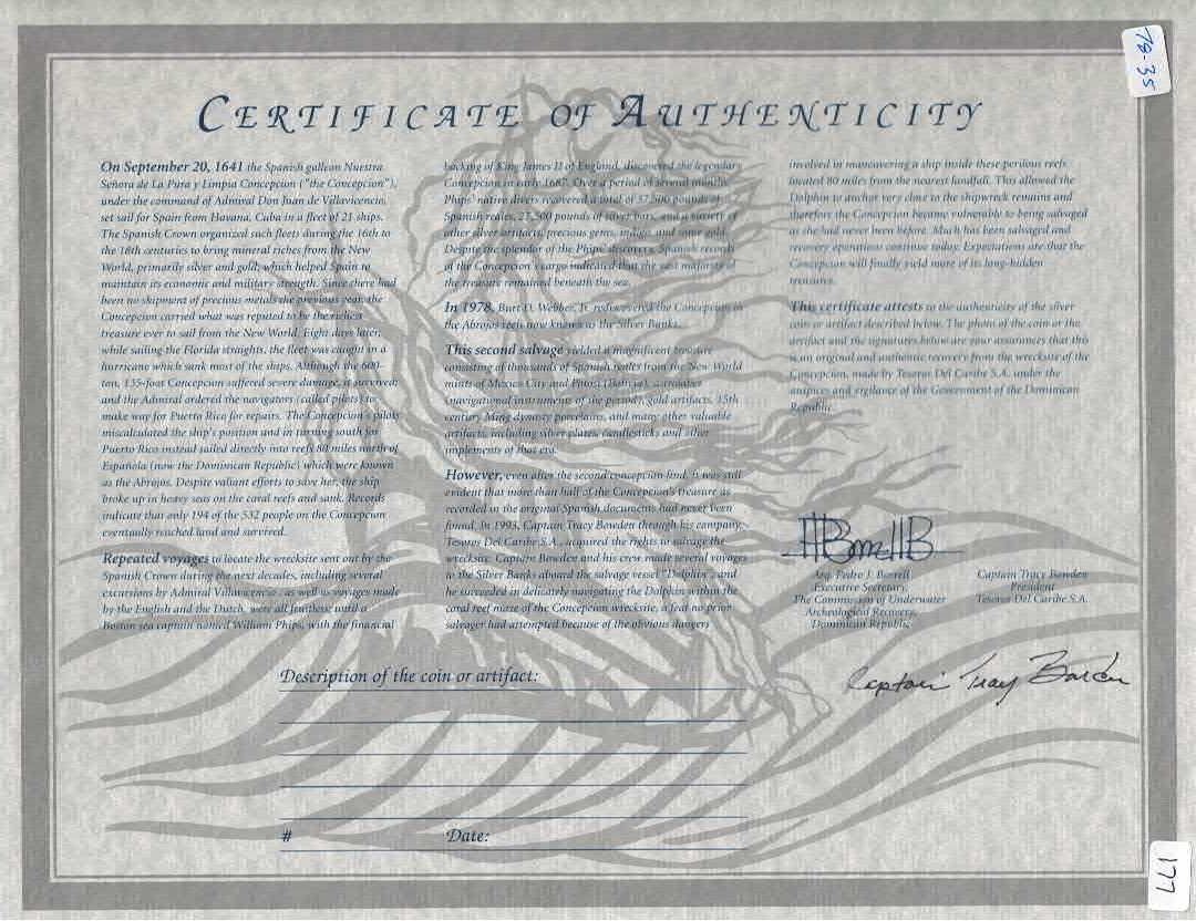 MEXICO, Mexico City, cob 4 reales, Philip IV, assayer P. S-M19; KM-38; Cal-Type 275. 13.40 grams. Nearly full cross and shield on a roundish flan with visible assayer, nicely toned, lightly surface-corroded. With original certificate from Captain Tracy Bowden through his contract with the Dominican Republic. Recovered from: Concepción, sunk in 1641 off Hispaniola