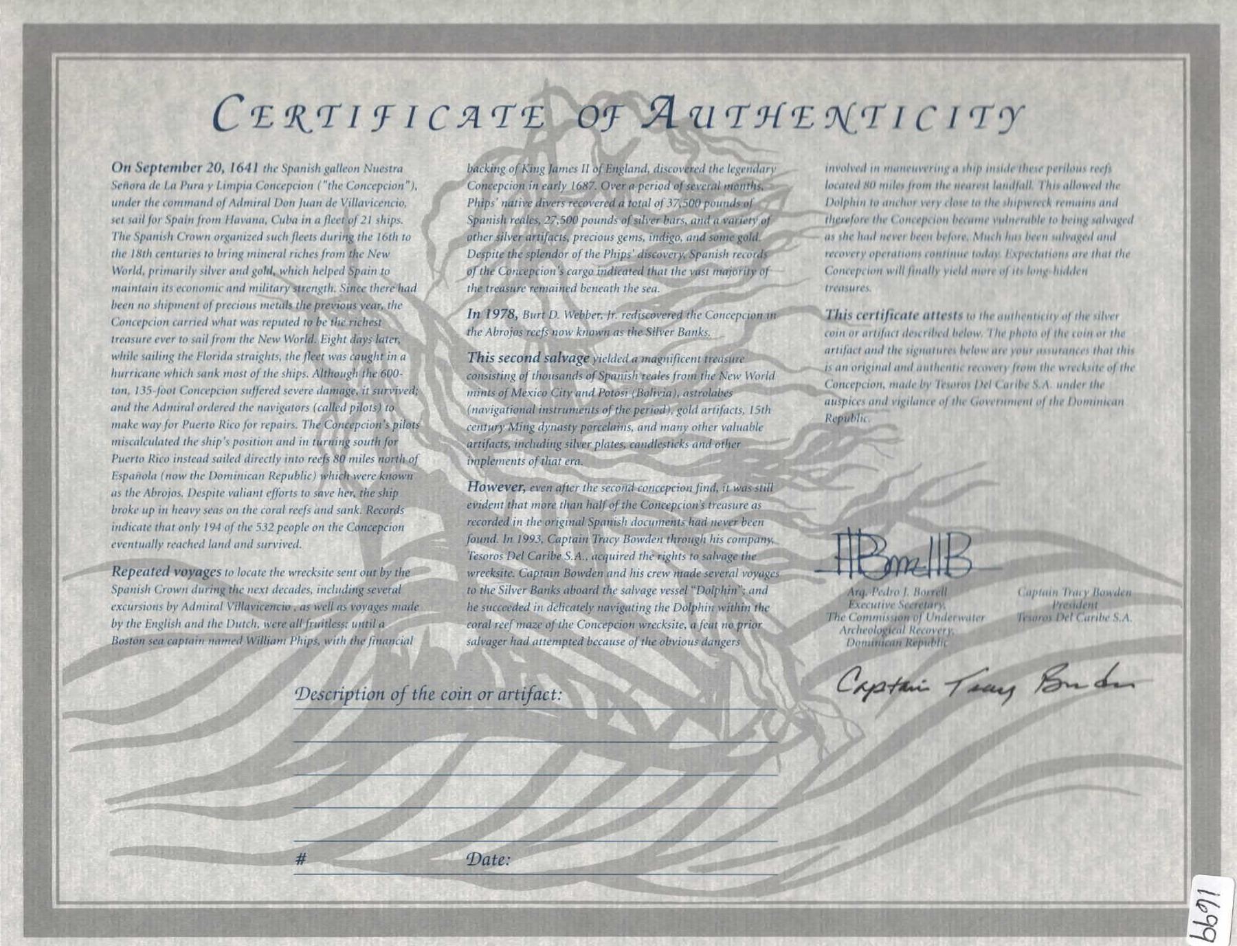 MEXICO, Mexico City, cob 4 reales, Philip IV, assayer P. S-M19; KM-38; Cal-Type 275. 12.36 grams. Quite nice with full oMP and bold shield with just a bit of corrosion near the edge, silvery reverse with nearly complete cross showing some strike weakness. With original certificate from Captain Tracy Bowden through his contract with the Dominican Republic. Recovered from: Concepción, sunk in 1641 off Hispaniola
