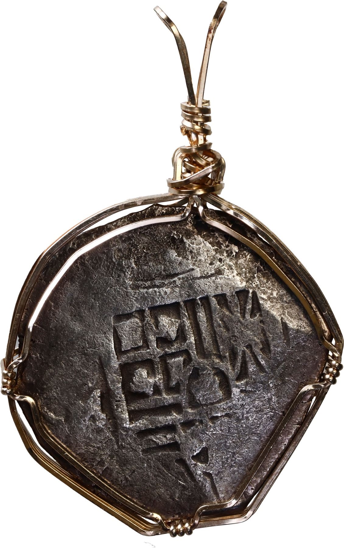 MEXICO, Mexico City, cob 4 reales, Philip IV, assayer not visible, ex-Concepción (1641), mounted cross-side out in 14K gold-wire pendant. 16.32 grams total. Nice full cross with silvery surfaces, some scratches in the peripheries, bold partial shield, a few surface pits here and there from saltwater exposure but otherwise solid. From the Concepción (1641), with original certificate from Captain Tracy Bowden through his contract with the Dominican Republic.