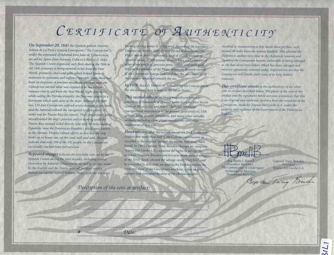 MEXICO, Mexico City, cob 4 reales, Philip IV, assayer not visible. KM-38; Cal-Type 275. 12.97 grams. Choice piece with very light surface corrosion, bold shield with clear denomination 4 to right, nice full cross. With original certificate from Captain Tracy Bowden through his contract with the Dominican Republic. Recovered from: Concepción, sunk in 1641 off Hispaniola