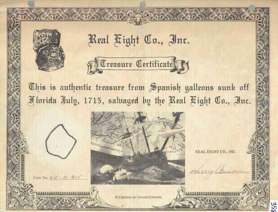 MEXICO, Mexico City, cob 4 reales, Philip V, assayer not visible (J), style of 1712-13, ex-Real Eight. S-M22; KM-40; Cal-Type 139. 12.68 grams. Good cross and shield (both nearly full), minimal corrosion (just near edge on reverse), unevenly toned. With original Real Eight Co. certificate hand-signed by Harry Cannon. Recovered from: Spanish 1715 Fleet, sunk off the east coast of Florida