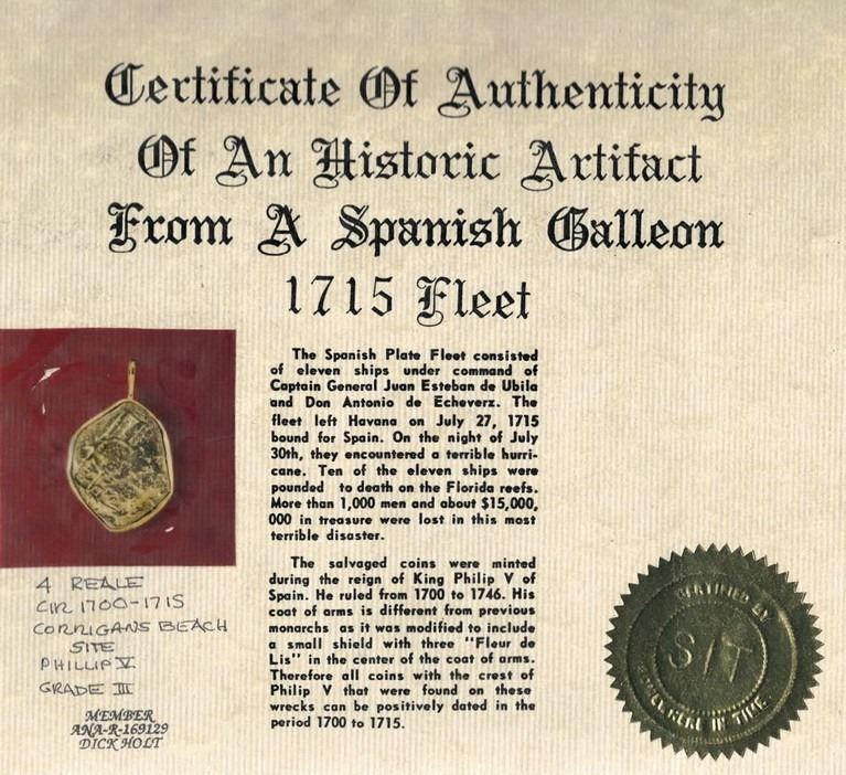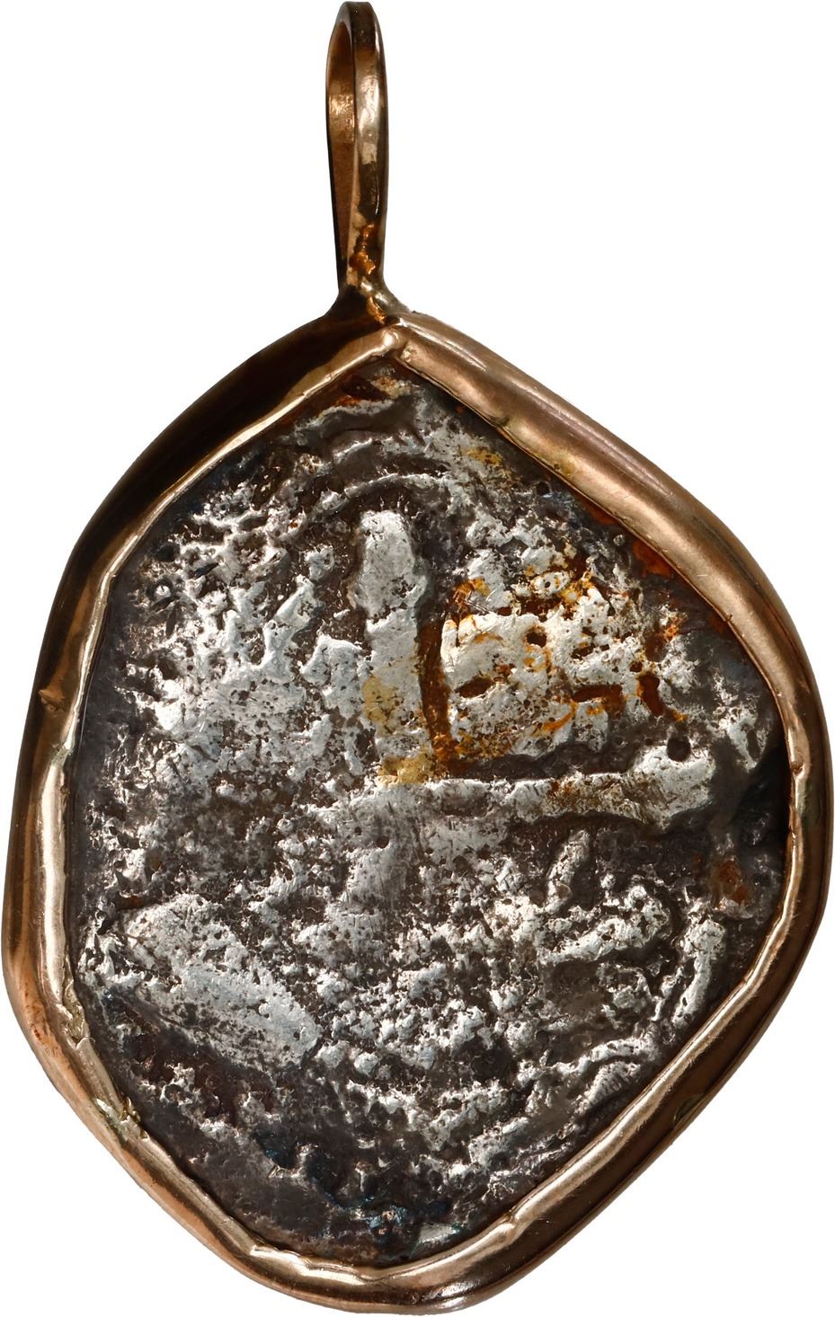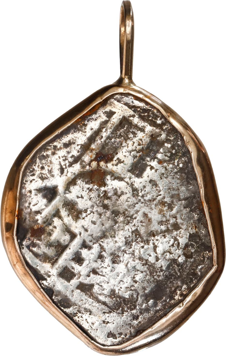 MEXICO, Mexico City, cob 4 reales, Philip V, assayer not visible, ex-1715 Fleet, mounted cross-side out in 14K gold pendant with fixed bail. 13.33 grams total. Corroded piece with partial cross, bold part of shield also visible, some red toning spots, nice provenance to the famous Corrigans wreck site of the 1715 Fleet. From the Corrigans site of the 1715 Fleet, with photo-certificate.