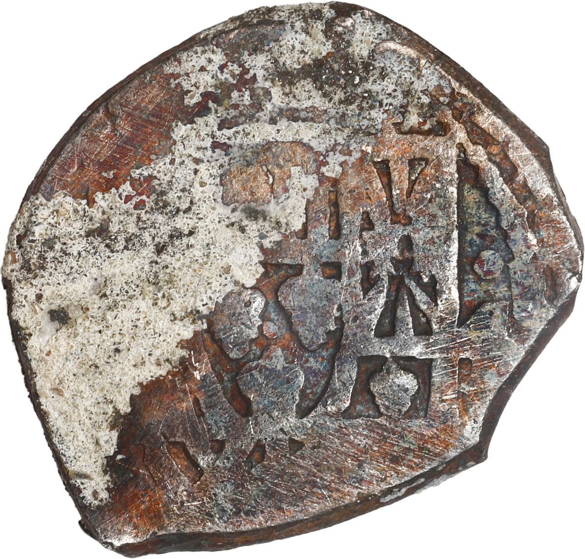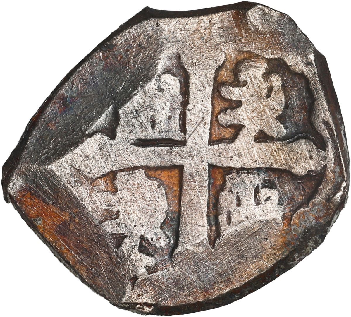 MEXICO, Mexico City, cob 4 reales "greenie," (1714-15) (J), new-style shield, old-style cross, encrusted as found. S-M22; KM-40; Cal-Type 139. 12.88 grams total. Good full cross and shield but the latter about 50% covered in whitish encrustation, rest of coin toned in black and copper colors. Pedigreed to Sedwick Auction 27, with original lot-tag 337. Recovered from: Spanish 1715 Fleet, sunk off the east coast of Florida