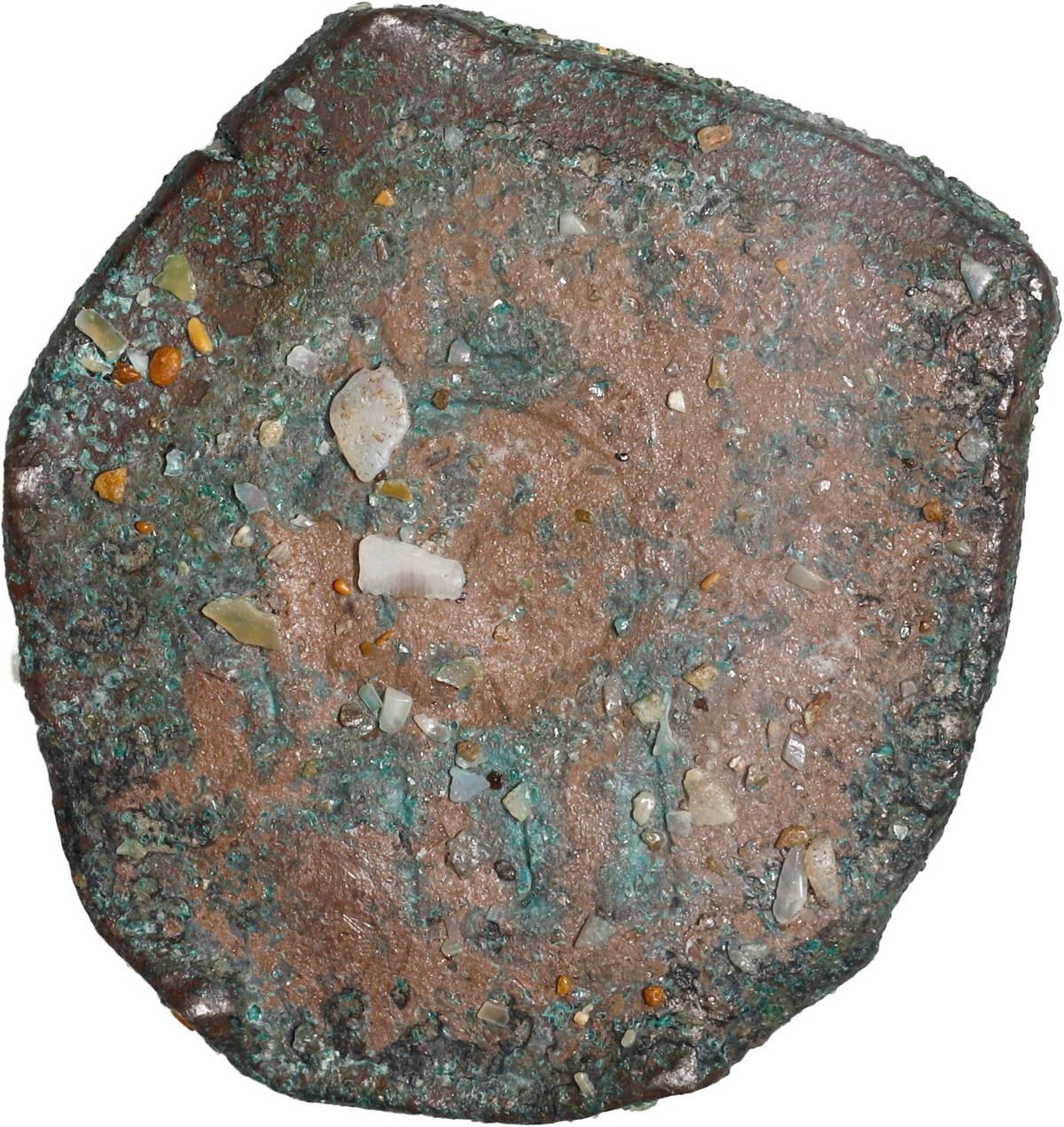 MEXICO, Mexico City, cob 4 reales "greenie," probably Philip V, assayer not visible, encrusted as found. 13.16 grams total. Roundish flan with faint trace of shield peeking through brownish oxidation on one side but the other side completely covered in lovely green crust. Pedigreed to Sedwick Auction 24, with original lot-tag 559. Recovered from: Spanish 1715 Fleet, sunk off the east coast of Florida