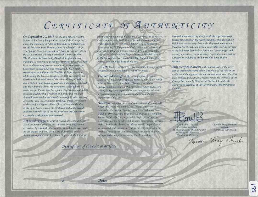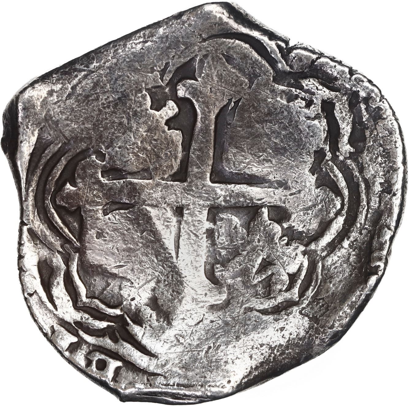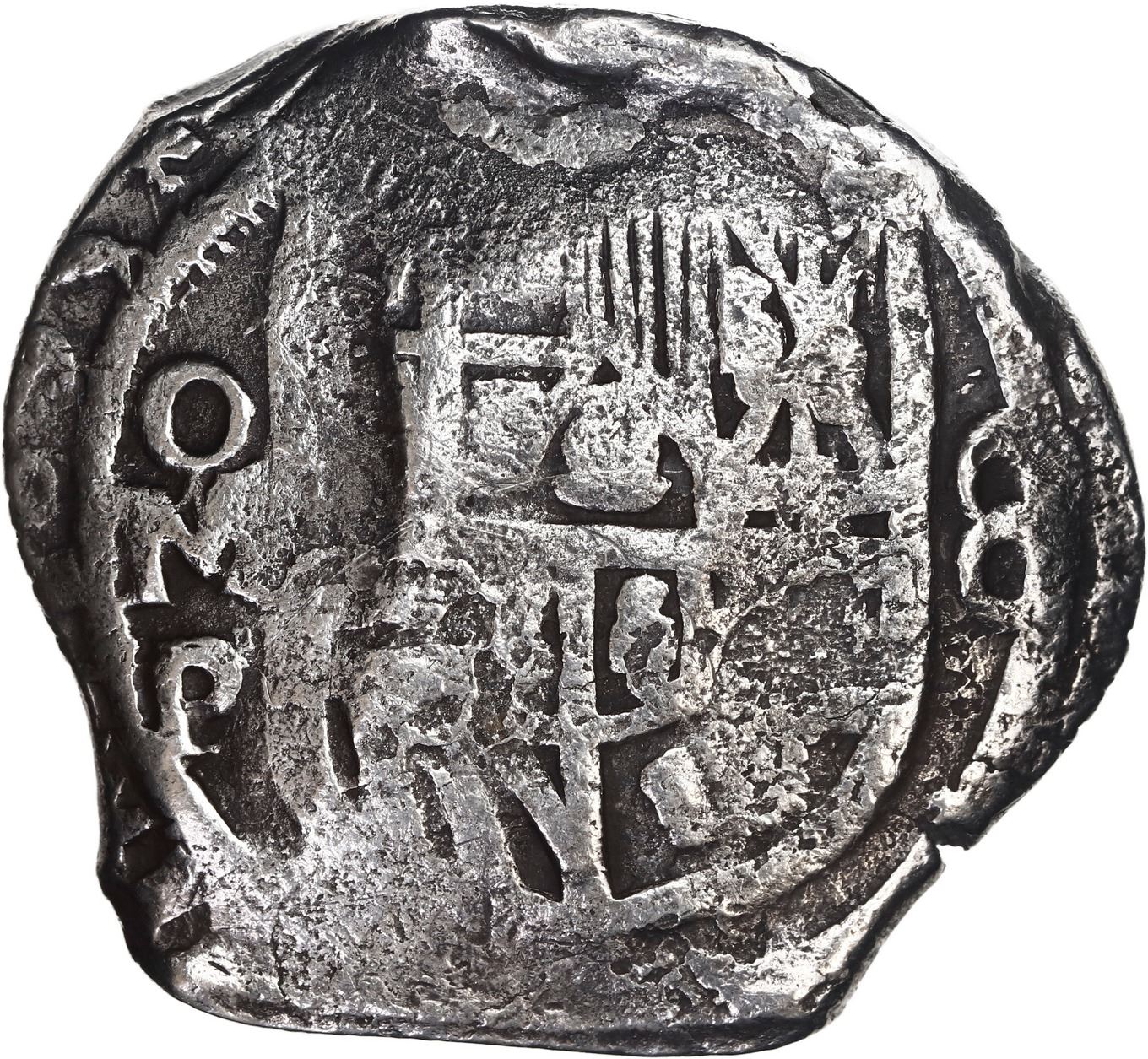 MEXICO, Mexico City, cob 8 reales, 1635/4 P, very rare. S-M19; KM-unl (45 for type); Cal-unl (Type 319). 24.49 grams. Fat barrel-shaped flan with weak spots but bold oMP and 8 flanking full shield, full cross, but best part is the bottom half of all four digits of the date in the legend shifted one digit to left with fleur-de-lis ornament punched over the prior digit 4 (i.e., 6/1, 3/6, 5/3, fleur/4), confirmed by style of shield (particularly the non-parallel diagonal lines in Old Burgundy), the assayer-mark P modified from the previous assayer D. With original certificate from Captain Tracy Bowden through his contract with the Dominican Republic. Recovered from: Concepción, sunk in 1641 off Hispaniola