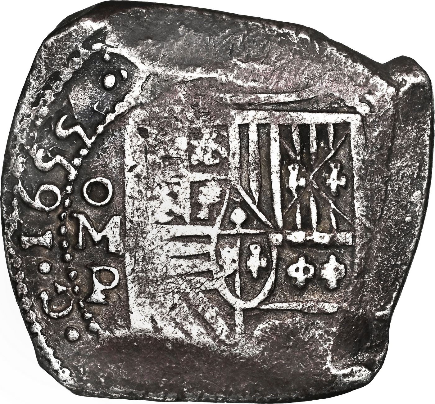 MEXICO, Mexico City, cob 8 reales, 1655/4 P, rare, NGC XF details / saltwater damage (Shipwreck Blue Label). S-M19; KM-45; Cal-unl (Type 319). 25.30 grams. Superb full date with clear but offset under-digit 4 and oMP to left of full shield, full but partially flat cross due to uneven thickness, deeply toned all over and virtually corrosion-free, truly one of the finest silver coins from this wreck. (Note: Coin is loose in the slab, and label does not mention the overdate.). with Sedwick photo-certificate from 2020. Recovered from: Maravillas, sunk in 1656 off Grand Bahama Island