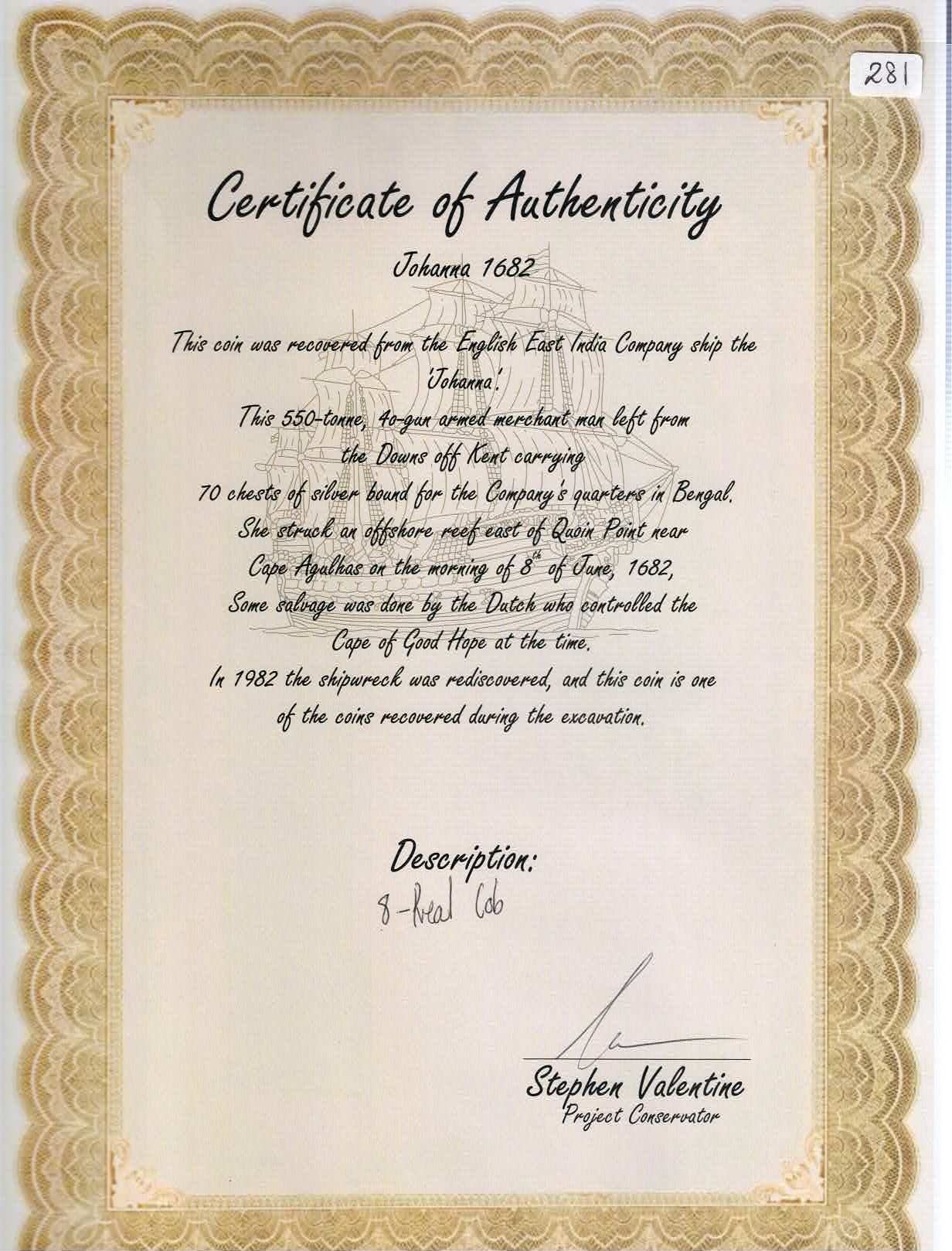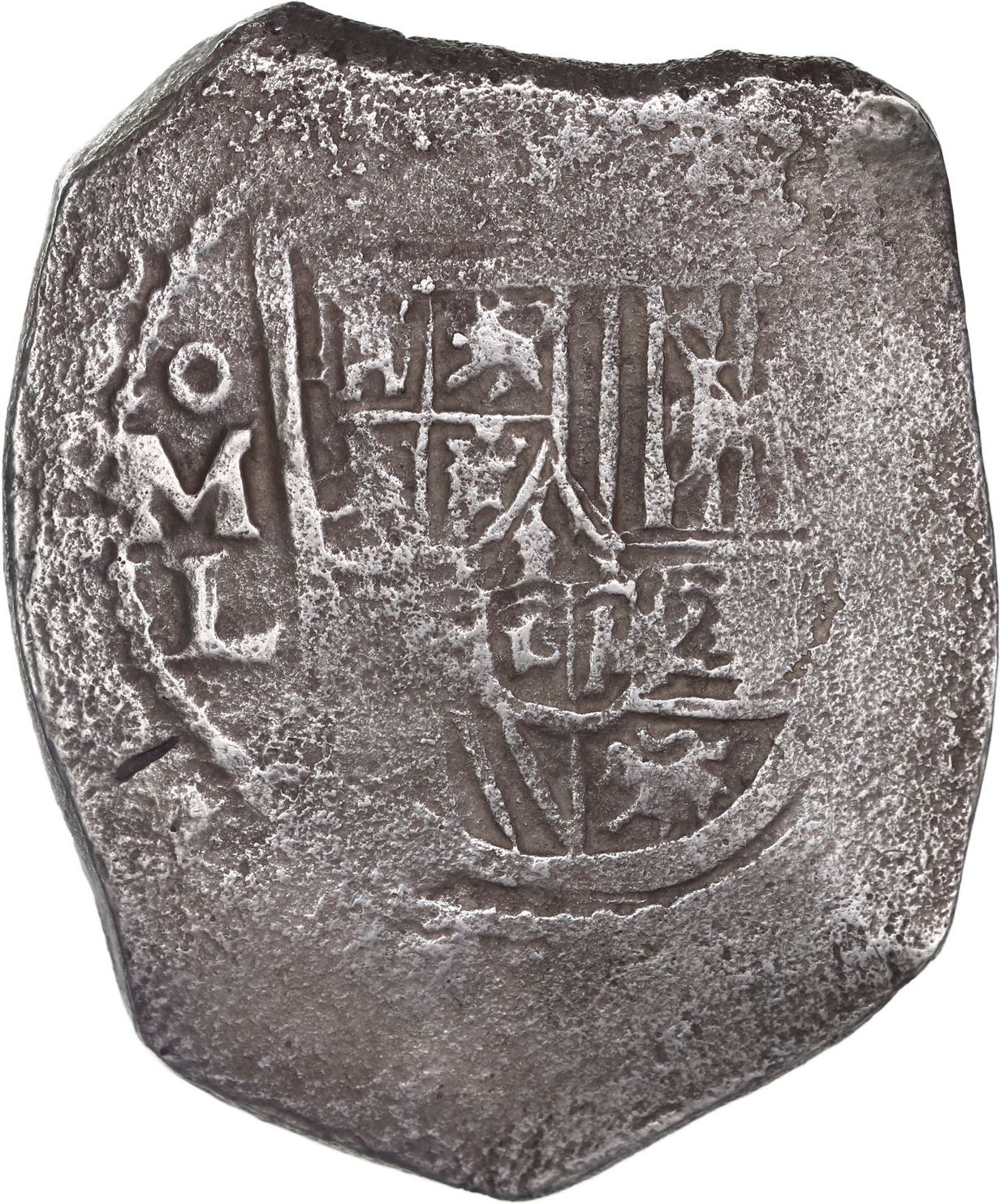 MEXICO, Mexico City, cob 8 reales, 1680 L. S-M21; KM-46; Cal-641. 24.08 grams. Broad flan with less corrosion than usual for this wreck, very bold full oML, bottoms of digits of date, good full shield and cross but peripherally flat as usual, very lightly toned. With original certificate from the salvor/conservator. Recovered from: Joanna, sunk in 1682 off South Africa
